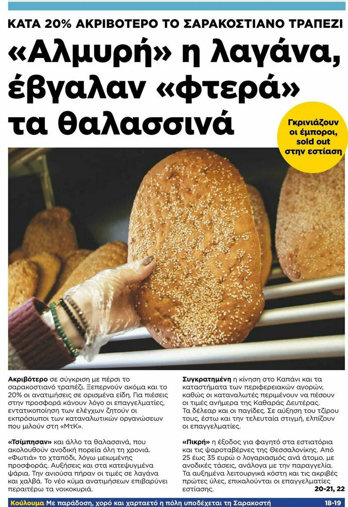 Το πρωτοσέλιδο της εφημερίδας «Μακεδονία» είναι αποκαλυπτικό: 20% ακριβότερο το σαρακοστιανό τραπέζι. Η λαγάνα έγινε «αλμυρή», τα θαλασσινά έβγαλαν «φτερά» και το χταπόδι έχει γίνει πλέον είδος πολυτελείας.