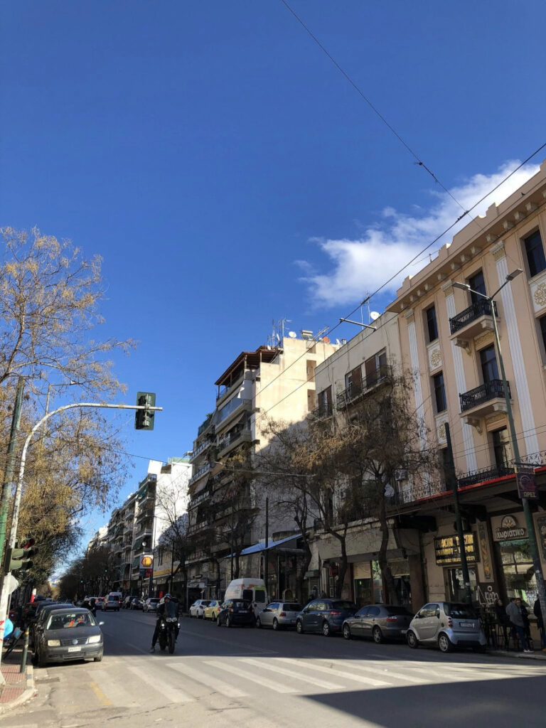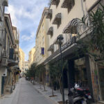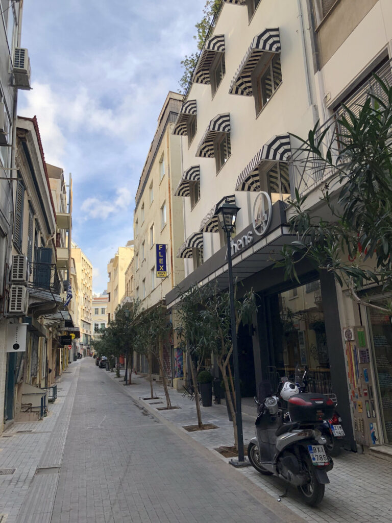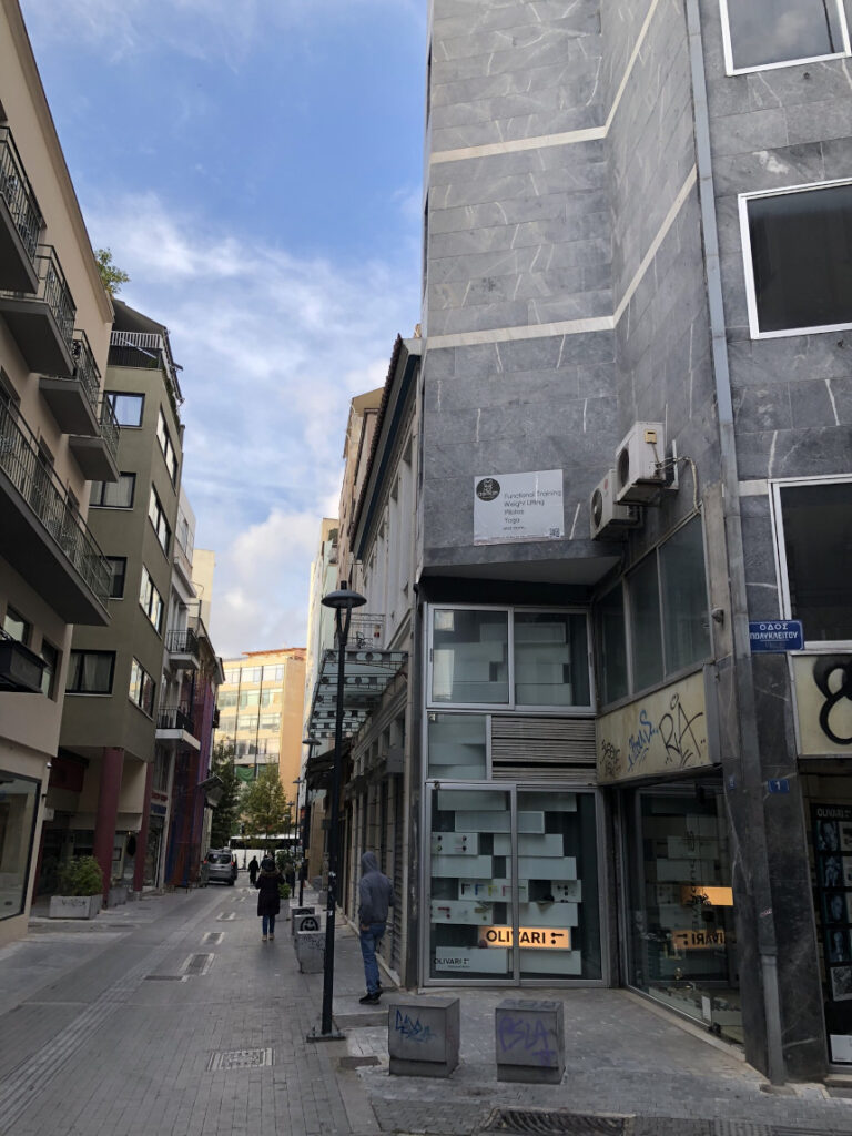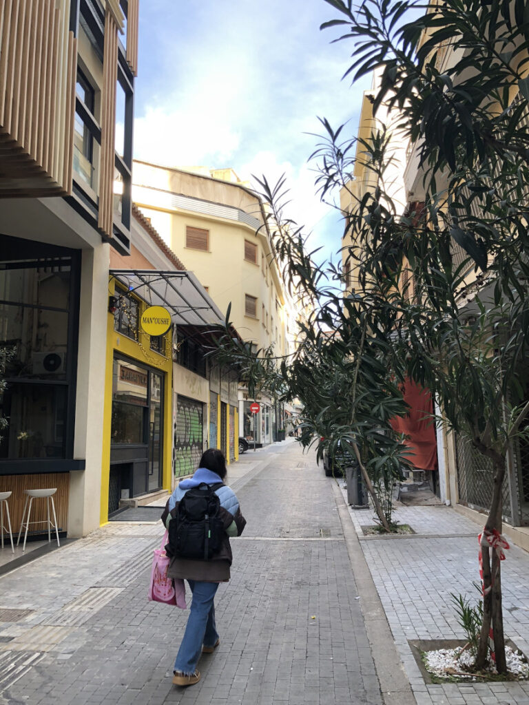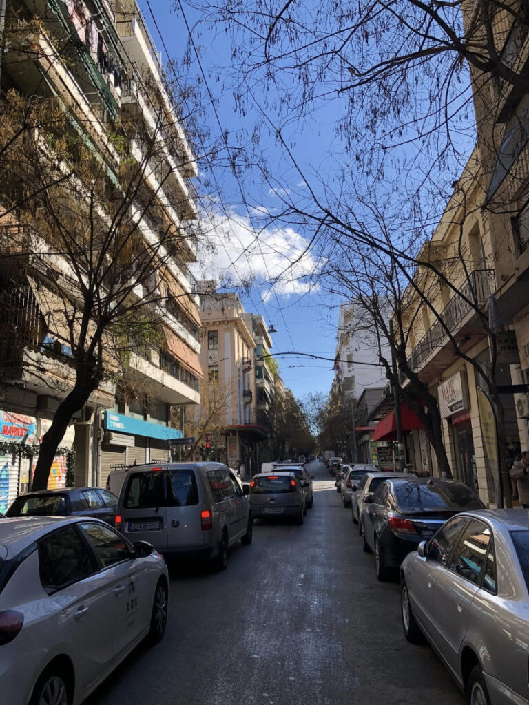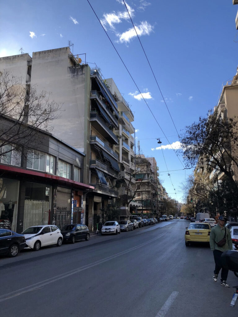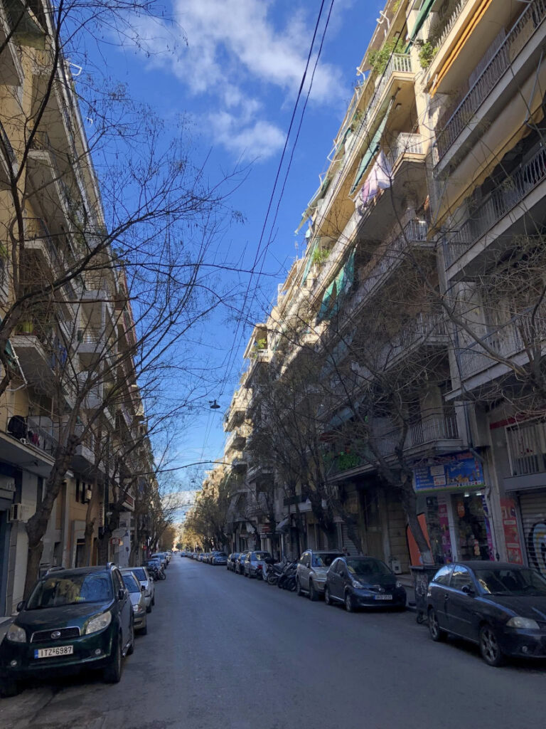 Αυτά τα “μικρά οδοιπορικά” σε δρόμους που πολλοί προσπερνούν, είναι που μας αποκαλύπτουν την αληθινή Αθήνα. Η Πολυκλείτου, στρωμένη με κυβόλιθους και στολισμένη με νεαρά δέντρα, μας καλεί να χαμηλώσουμε ταχύτητα. Να παρατηρήσουμε τα γκράφιτι στις κατεβασμένες ρολοκουρτίνες, τις μονάδες κλιματισμού που μαρτυρούν τη ζωή μέσα στα κτίρια, και το γαλάζιο του αθηναϊκού ουρανού που ξεπροβάλλει ανάμεσα στις πολυκατοικίες.