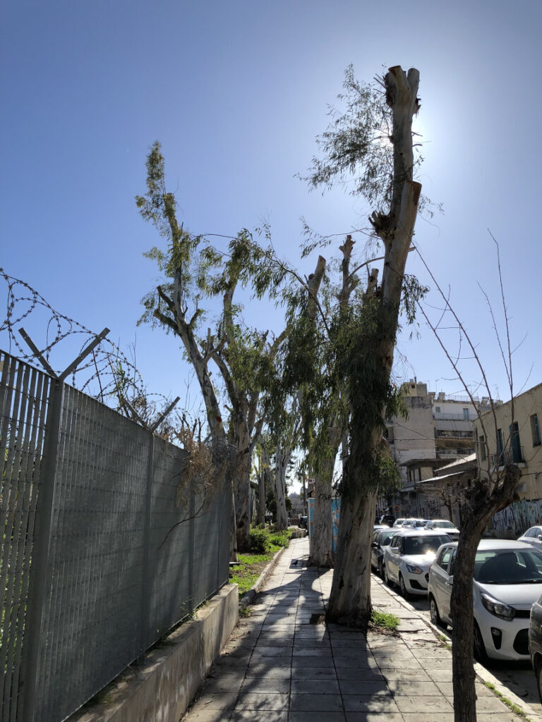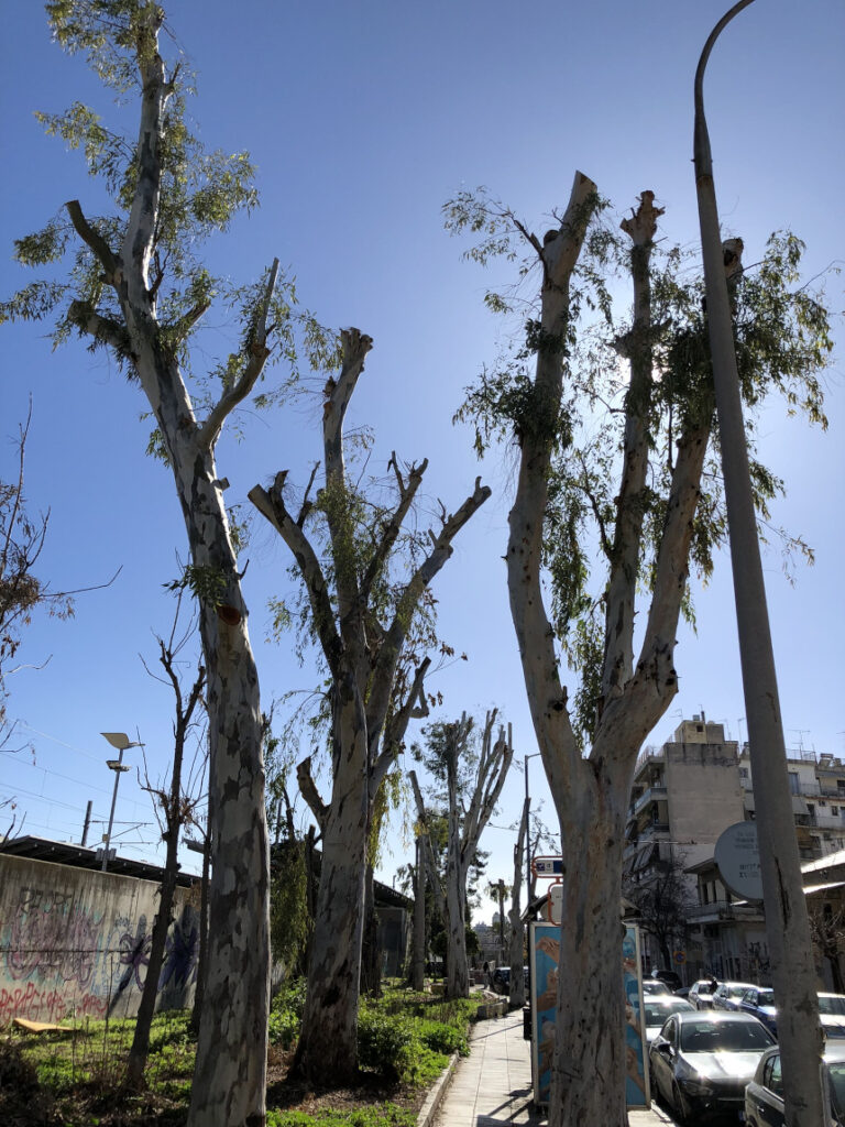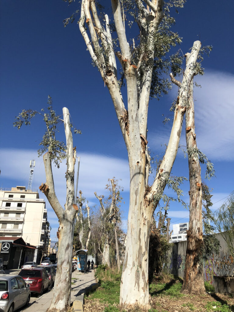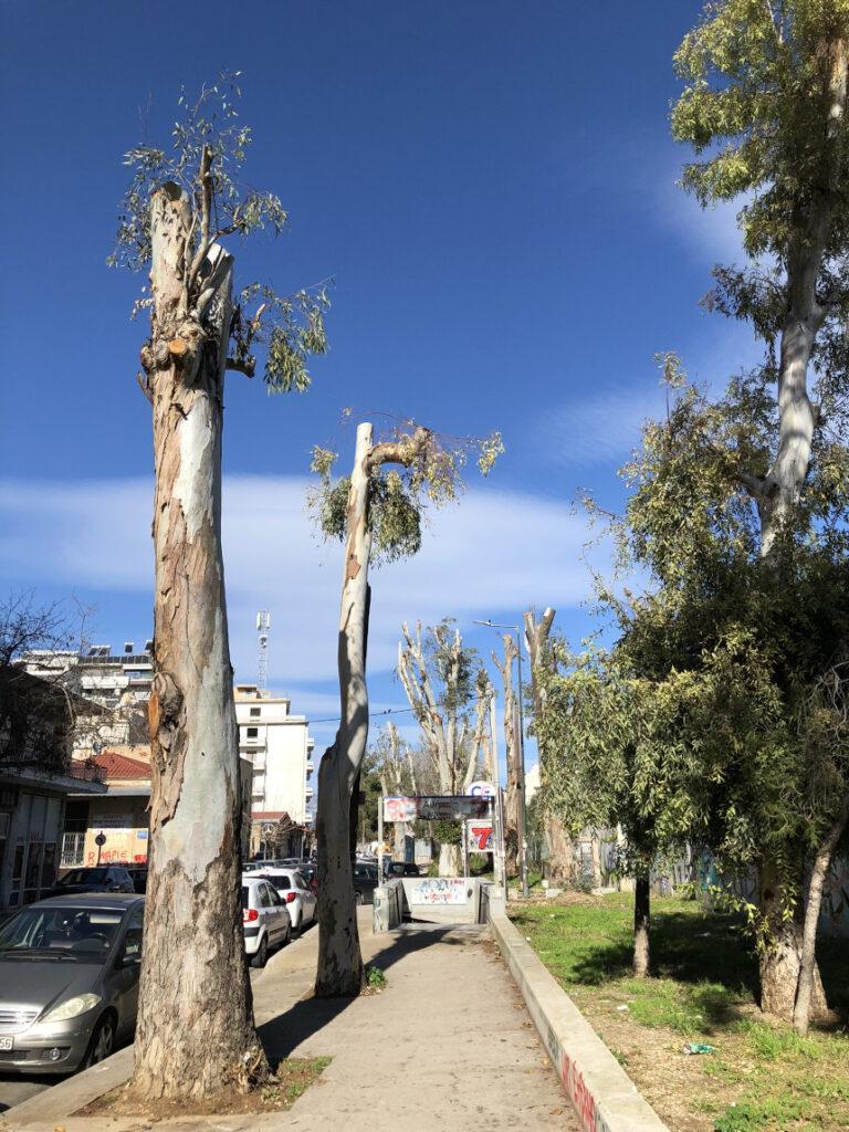 Η βόλτα από τα Σεπόλια προς τον Κολωνό, εκεί κοντά στην είσοδο του Σταθμού Λαρίσης από την Κωνσταντινουπόλεως, κρύβει τελευταία μια εικόνα που προκαλεί θλίψη και ερωτηματικά. Οι άλλοτε επιβλητικοί ευκάλυπτοι, στέκουν πλέον σαν “σκελετοί”. Το κλάδεμα που υπέστησαν δεν ήταν μια απλή συντήρηση, αλλά μια βαθιά καρατόμηση που άλλαξε ριζικά το τοπίο της γειτονιάς μας.