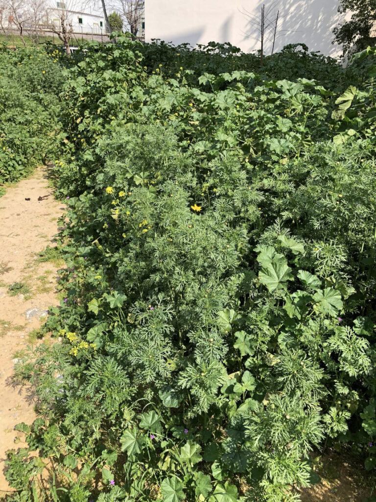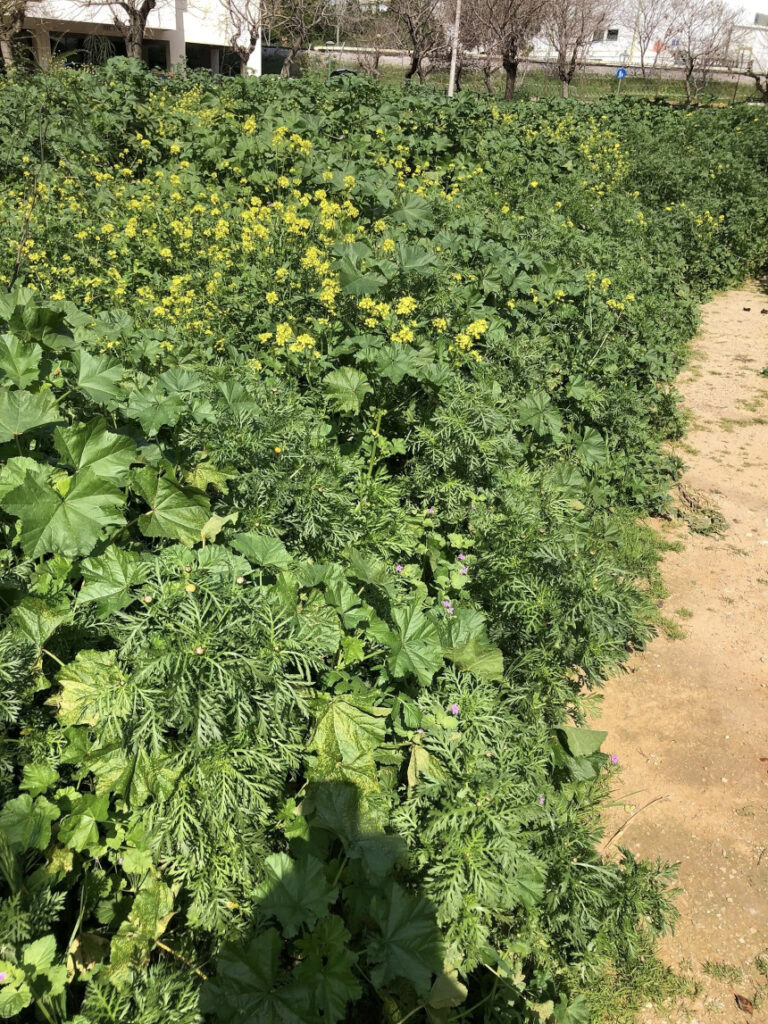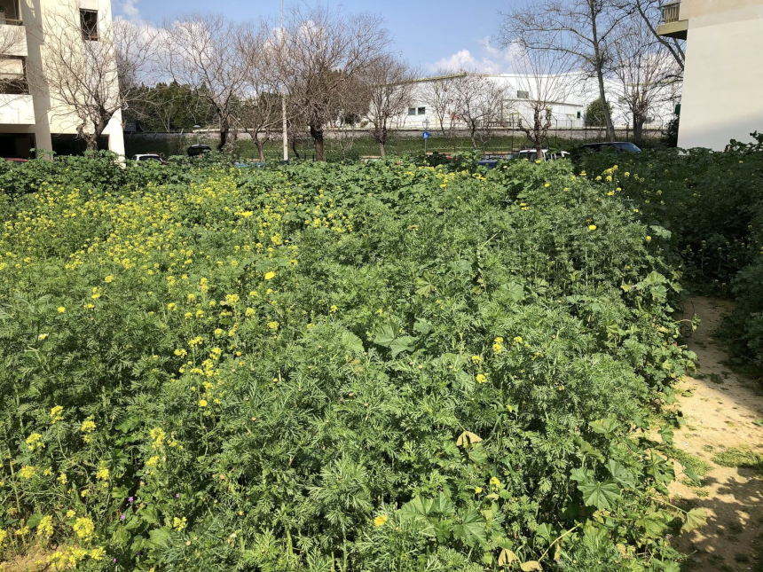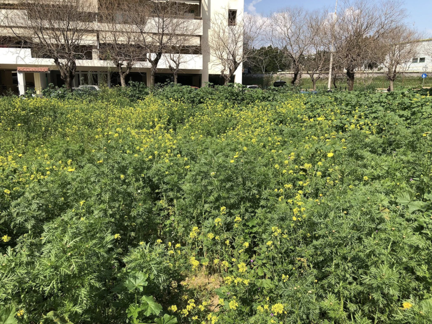 Μολόχες, άγρια σινάπια με κίτρινα άνθη και μαργαρίτες καταλαμβάνουν τον χώρο, μετατρέποντας τα εγκαταλελειμμένα οικόπεδα σε αυθόρμητους πνεύμονες πρασίνου. Είναι η στιγμή που η φύση διεκδικεί το δικό της μερίδιο στο αθηναϊκό τοπίο, προσφέροντας μια οπτική και ψυχική ανάσα στους περαστικούς και τους κατοίκους των γύρω πολυκατοικιών.