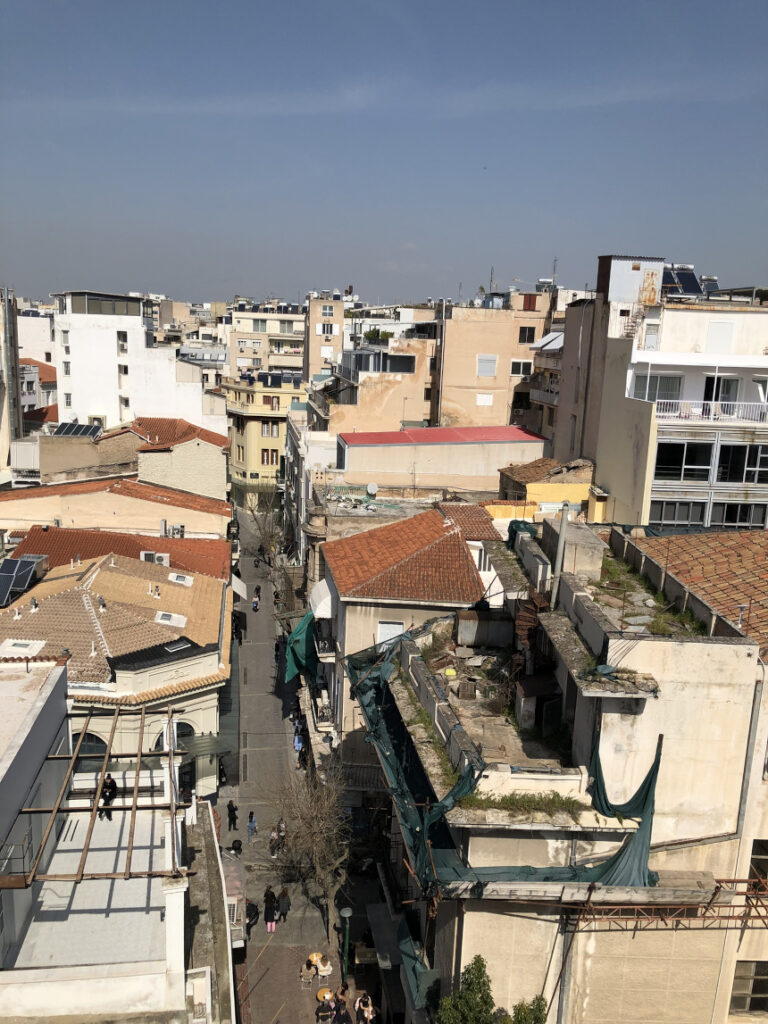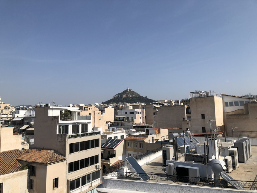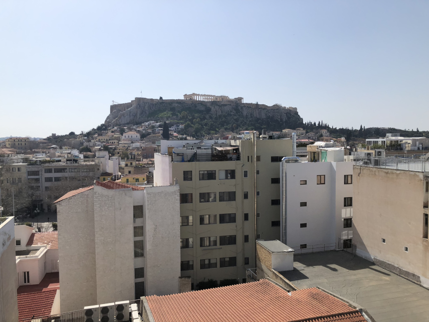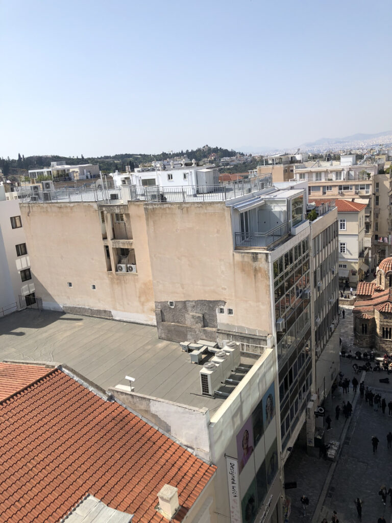 Η Ακρόπολη, επιβλητική και σε απόσταση αναπνοής, δεσπόζει στον ορίζοντα, ενώ ο Λυκαβηττός ξεπροβάλλει ανάμεσα στις στέγες, θυμίζοντάς μας τη διαχρονική γοητεία αυτής της πόλης. Οι κόκκινες κεραμοσκεπές της Πλάκας και τα στενά σοκάκια γύρω από την Ερμού συνθέτουν ένα μωσαϊκό που συνδέει το χθες με το σήμερα. Παλιά και νεότερα προσπαθούν να έχουν κοινή παρουσία.