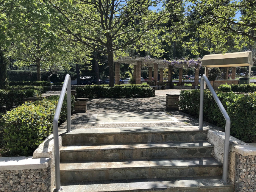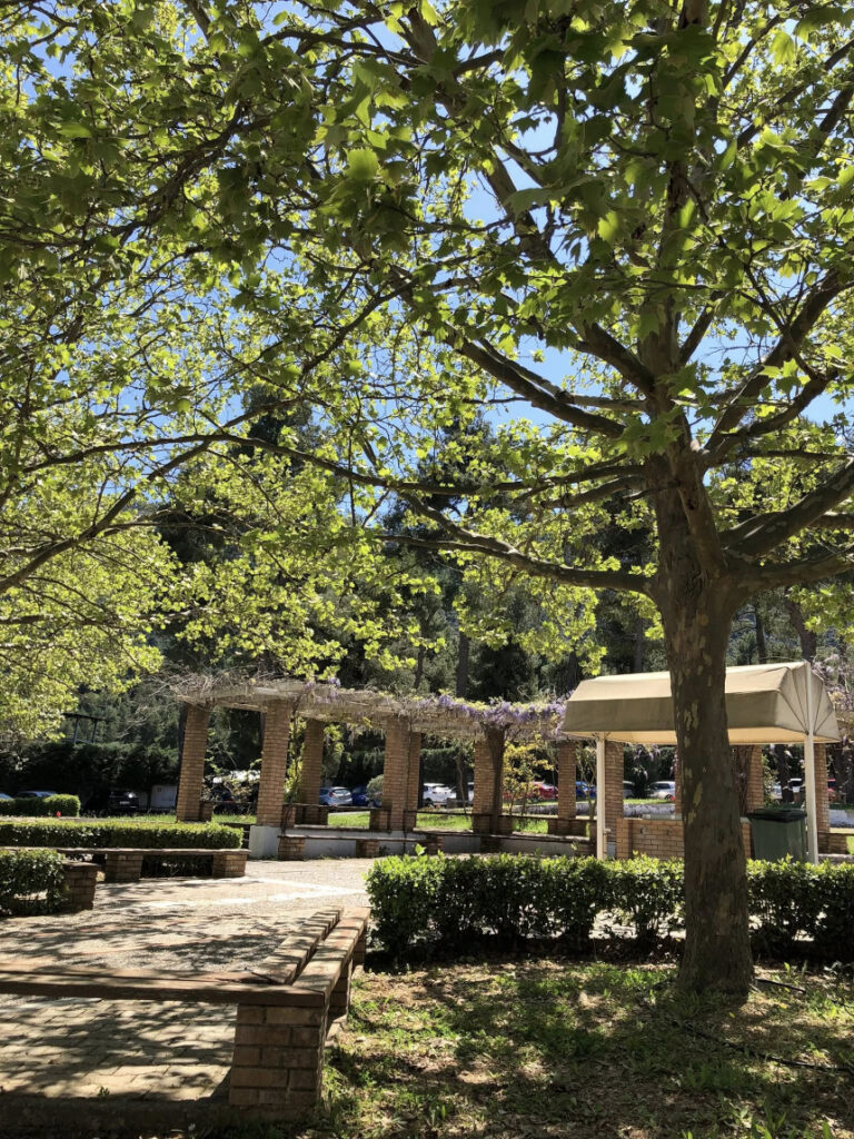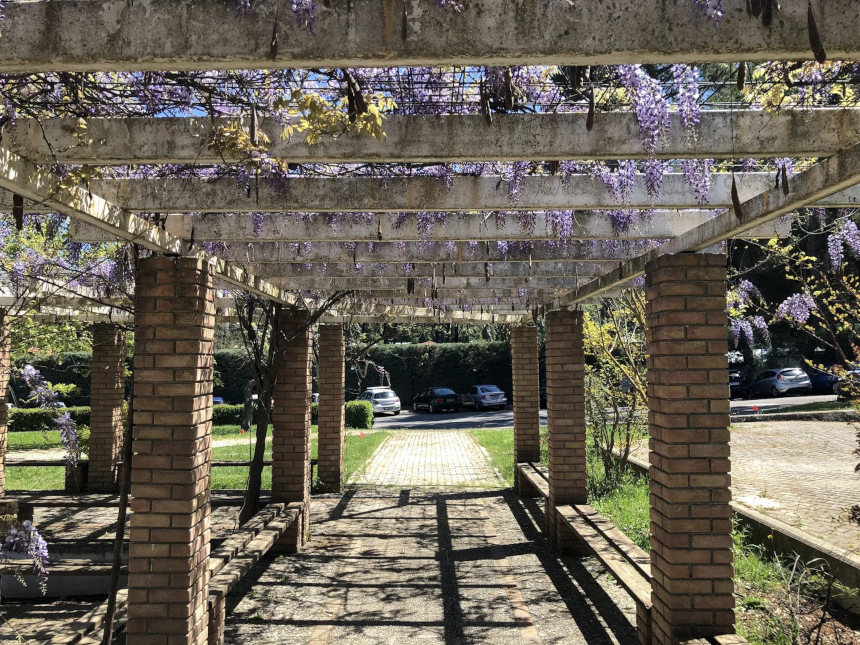 Οι εικόνες που καταγράψαμε μαρτυρούν μια «πρώιμη άνοιξη» που ξεδιπλώνεται αργά και σταθερά, γεμίζοντας το βλέμμα με χρώματα και φως. Περπατώντας κάτω από τις ανθισμένες πέργκολες, με τις μωβ γλυσίνες να κρέμονται σαν φυσικά κοσμήματα, νιώθεις την ηρεμία που προσφέρει η φύση όταν βρίσκεται σε πλήρη αρμονία με τον χώρο. Οι σκιές που δημιουργεί ο μεσημεριανός ήλιος πάνω στα πλακόστρωτα μονοπάτια, οι πέτρινοι κίονες που στέκουν αγέρωχοι και το έντονο πράσινο των δέντρων, συνθέτουν ένα σκηνικό που μοιάζει σχεδόν με «σοκ» — ένα θετικό, ευχάριστο ξάφνιασμα για τις αισθήσεις.