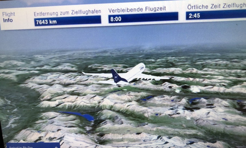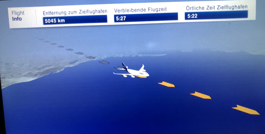 Κάτι διαφορετικό ήταν επίσης ο τρόπος που έδειχνε το ταξίδι μας στη οθόνη στο μπροστινό κάθισμα. Το βλέπετε στις φωτογραφίες. Μερικές φορές νόμιζες πως μας ακολουθούσε μια κάμερα από τον ουρανό, τόσο ρεαλιστική απεικόνιση είχε. Καλό και πλούσιο το γεύμα που προσφέρθηκε και για πρώτη φορά είδα αληθινά μεταλλικά σερβίτσια, πιρούνι, κουτάλι, μαχαίρι.