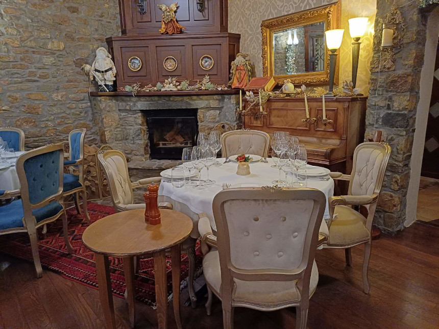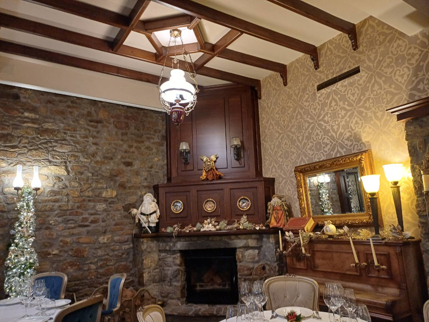 Οι τοίχοι είναι επενδυμένοι με την τοπική πέτρα, προσδίδοντας στιβαρότητα, αίσθηση μονιμότητας και μια ρουστίκ κομψότητα. Η πέτρα, σε συνδυασμό με το ζεστό ξύλο των πατωμάτων και των οροφών (όπως φαίνεται στην εικόνα 3 με τα εμφανή δοκάρια), δημιουργεί ένα περιβάλλον που σε αγκαλιάζει. Στο κέντρο του χώρου δεσπόζει ένα πέτρινο τζάκι που, ειδικά τους χειμερινούς μήνες, γίνεται η καρδιά της ταβέρνας. Περιτριγυρισμένο από αντίκες, επιβλητικά ξύλινα έπιπλα, και έναν παλιό καθρέφτη με χρυσή κορνίζα, η ατμόσφαιρα μετατρέπεται σε παραμυθένια.