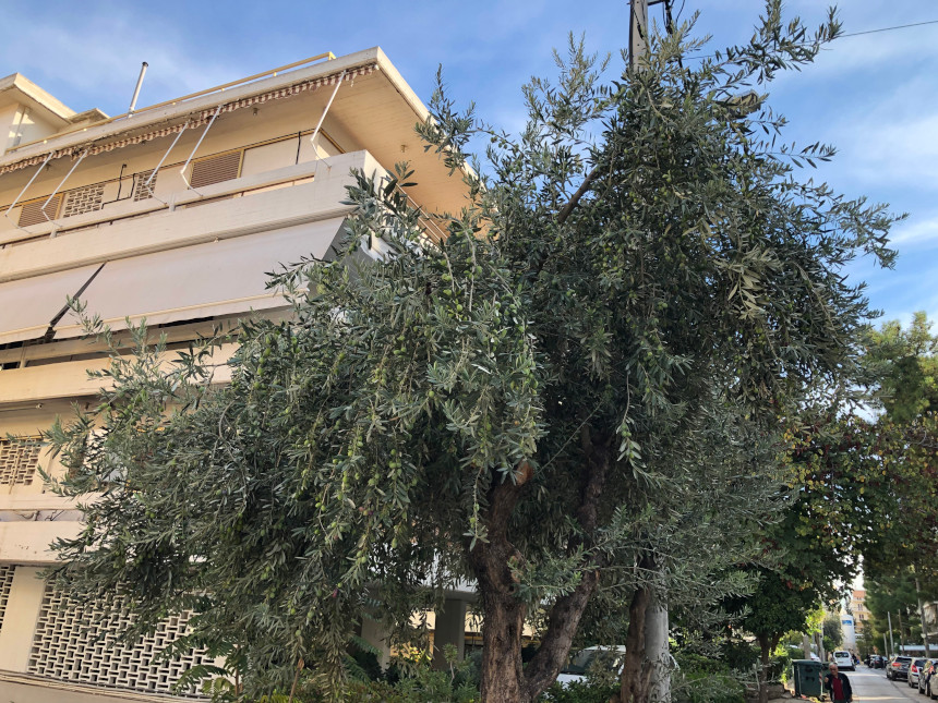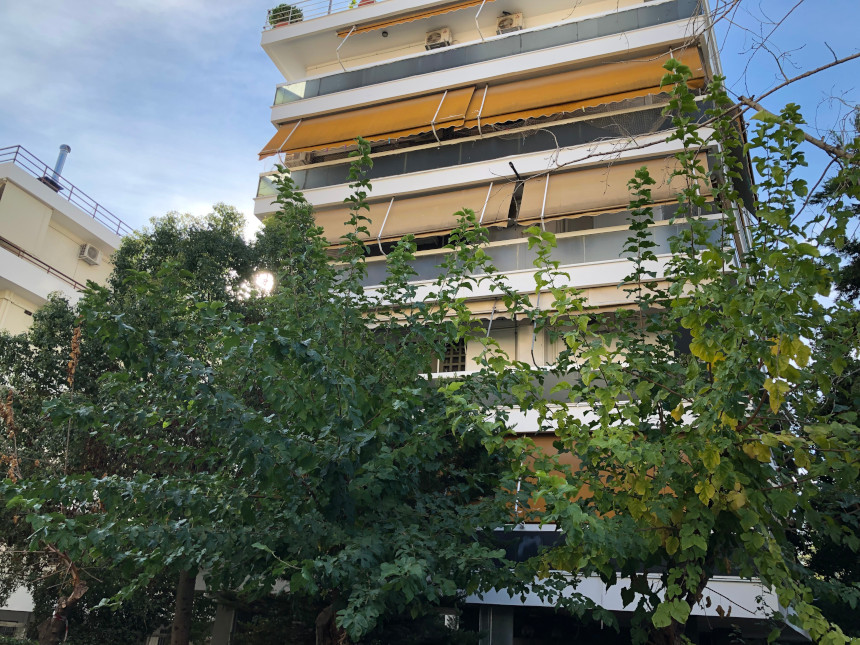 Οι πολυκατοικίες παρατάσσονται δεξιά, με τα αυτοκίνητα να έχουν καταλάβει το πεζοδρόμιο, μια εικόνα τόσο χαρακτηριστική της Αθήνας. Όμως, η φωτεινότητα και η βλάστηση απαλύνουν το τοπίο.Προχωρώντας, το μάτι μου σταμάτησε σε ένα τυπικό δείγμα της αθηναϊκής αρχιτεκτονικής του ’70 ή ’80. Ένα κτίριο με τα χαρακτηριστικά, φαρδιά μπαλκόνια και τις τέντες σε αποχρώσεις του κίτρινου. Ακόμη και οι φθαρμένες τέντες έχουν μια νοσταλγική γοητεία. Η πυκνή, ζωηρή βλάστηση μπροστά του, σχεδόν “καταπίνει” το κάτω μέρος του κτιρίου, δημιουργώντας μια πράσινη ασπίδα.
