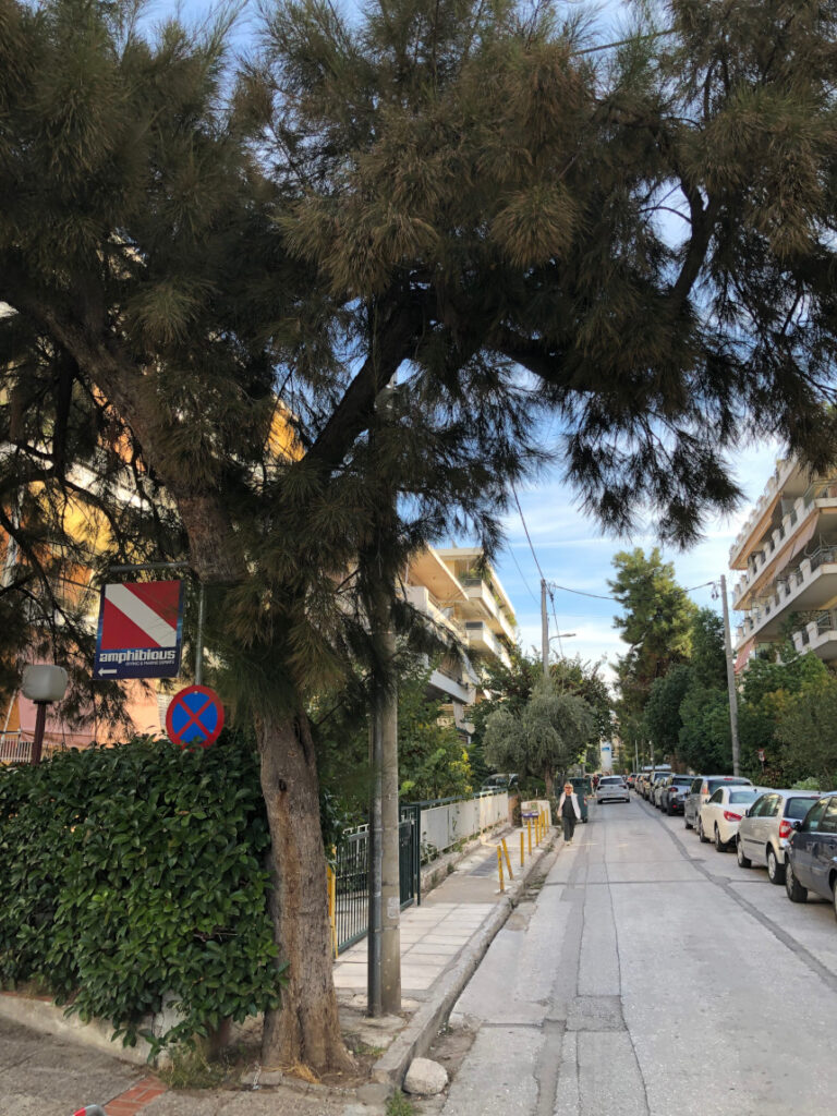 Παρόλο που το περιβάλλον ενός νοσοκομείου από μόνο του δεν είναι ευχάριστο, ο χώρος γύρω από αυτό αποπνέει ηρεμία. Τα περιποιημένα δέντρα προσφέρουν μια πινελιά πράσινου, κάνοντας την “ανάγκη” λιγότερο πιεστική. Ας ρίξουμε λίγο μια ματιά στην περιοχή. Στους γύρω δρόμους, μακριά από τη φασαρία της Μεσογείων. Εκεί, ο Χολαργός αποκαλύπτει το γνώριμο, οικείο του πρόσωπο. Ένα πυκνόφυλλο πεύκο ρίχνει τη σκιά του στον πεζόδρομο, ενώ ακριβώς δίπλα, η ελληνική πραγματικότητα: μια πινακίδα απαγόρευσης στάθμευσης, κάτω από την πινακίδα για το “Amphibious”.