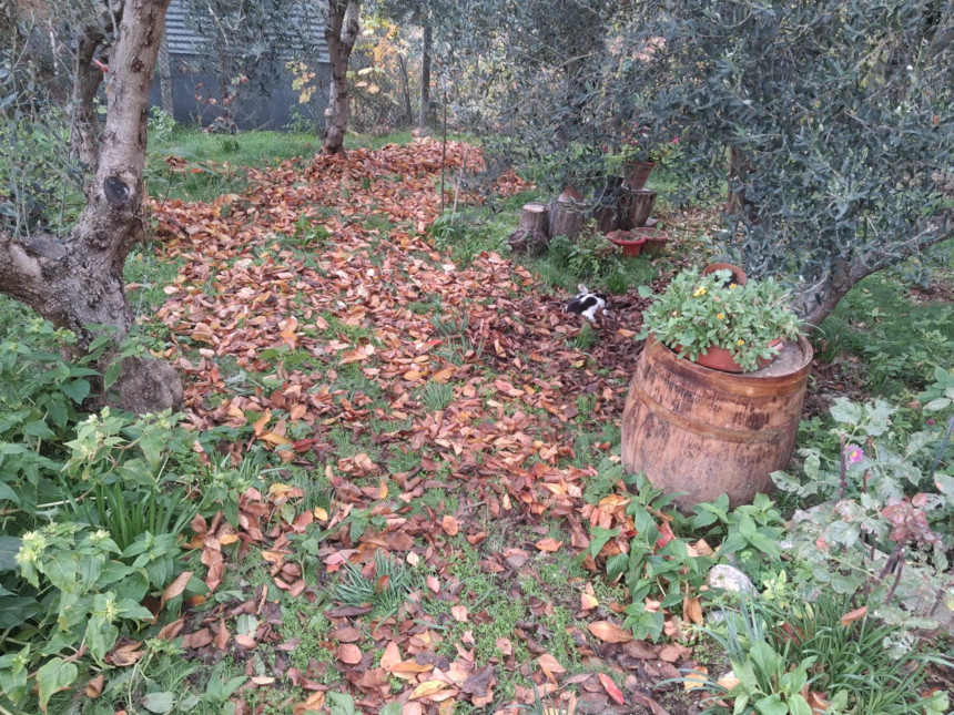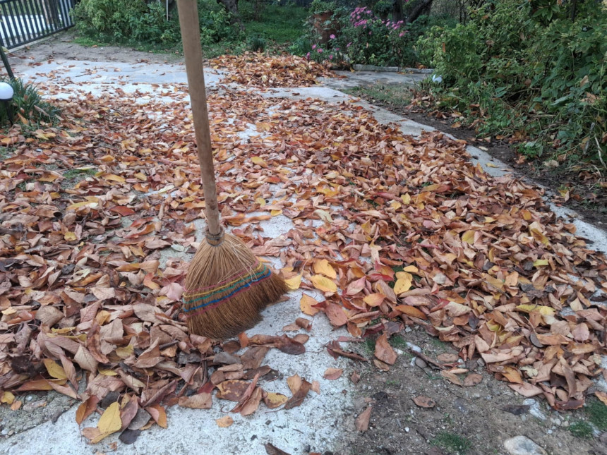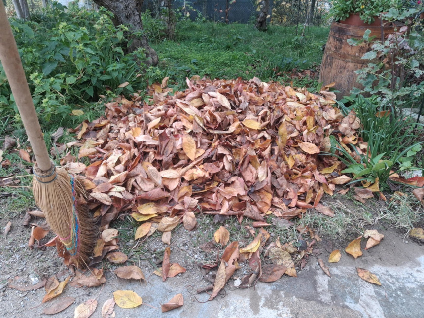 Όπως βλέπετε και στις φωτογραφίες μας, ο καθαρισμός της αυλής δεν είναι αγγαρεία. Είναι μια διαδικασία που μπορεί να γίνει με κέφι και διάθεση για ζωή! Με μια απλή, παραδοσιακή σκούπα, το χρυσό χαλί των φύλλων μετατρέπεται σε έναν ψηλό, εντυπωσιακό σωρό. Η αυλή, στρωμένη με φύλλα, μαρτυρά την εποχή. Η σκούπα μπαίνει στη δράση, συγκεντρώνοντας το υλικό σε έναν εντυπωσιακό σωρό. Η εικόνα του καθαρού πια διαδρόμου και του τακτοποιημένου σωρού δίπλα στα ελαιόδεντρα είναι η καλύτερη ανταμοιβή.