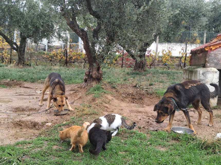Πιο κοντά στο έδαφος, συναντάμε τους πιστούς φύλακες του Ηλία. Τα δύο σκυλιά που επιβλέπουν τα πάντα, ακόμα και κατά τη διάρκεια του φαγητού, όταν είναι δεμένα με τις αλυσίδες τους. Παρόλο που δείχνουν άγρυπνα, μοιράζονται τον ίδιο χώρο, την ίδια λάσπη και τον ίδιο ουρανό με τη μικρή κοινότητα των γατών. Οι γάτες, μια μικρή οικογένεια με την πορτοκαλί, την ασπρόμαυρη και τη μαύρη, κινούνται με την αθόρυβη χάρη των αλεπούδων. Δεν υπάρχει ανταγωνισμός για το φαγητό.