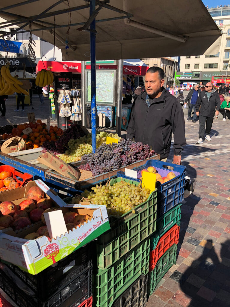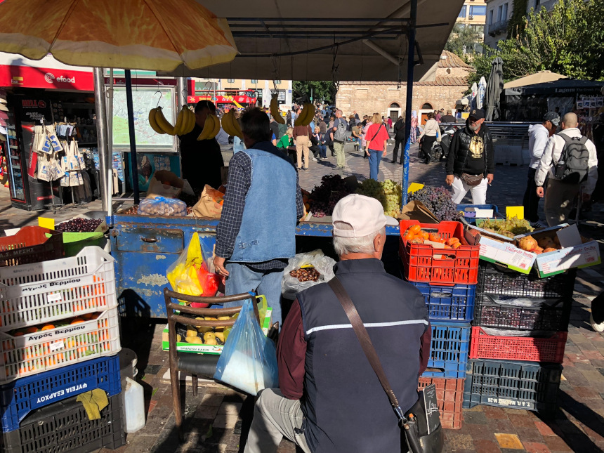 Στο κέντρο της Αθήνας, εκεί που η ιστορία συναντά τη βουή της σύγχρονης πόλης, ο χρόνος μερικές φορές σταματά μπροστά σε έναν απλό, μπλε πάγκο. Στην πλατεία Μοναστηρακίου, κάτω από τον αττικό ήλιο, οι “θησαυροί” της ελληνικής γης περιμένουν τους περαστικούς. Γυαλιστερά, σταφύλια γεμάτα γλύκα και φρούτα εποχής στοιβάζονται με τάξη στα τελάρα, δημιουργώντας μια παλέτα χρωμάτων που σπάει το γκρι της πόλης. Ανάμεσα στους τουρίστες που βιάζονται και τους ντόπιους που κάνουν τη βόλτα τους, αυτός ο πάγκος είναι μια υπενθύμιση της απλότητας. Μια γρήγορη στάση για μια μπουκιά δροσιάς, μια γεύση αυθεντικής Αθήνας στο χέρι, πριν χαθείς ξανά στα στενά της Πλάκας.