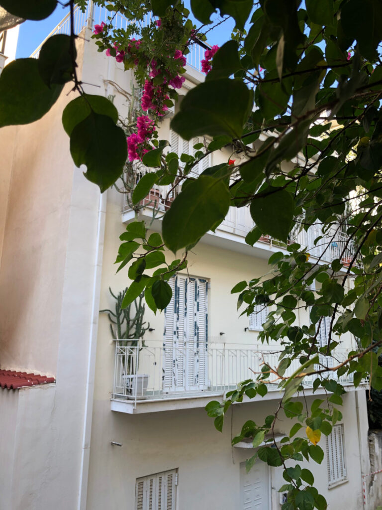 Εδώ φαίνεται κυρίως η ροζ/φούξια βουκαμβίλια να αναρριχάται και να κρέμεται από τον πάνω όροφο. Η σύνθεση είναι πολύ ατμοσφαιρική, με τα μεγάλα πράσινα φύλλα στο προσκήνιο να δημιουργούν ένα φυσικό πλαίσιο (κάδρο), αναδεικνύοντας τα άνθη. Δεν το περίμενα, αλλά έγινε. Κι αυτή είναι η απαράμιλλη ομορφιά των λουλουδιών που σε κάνει να τα αγαπάς και να τα θες στη ζωή σου.