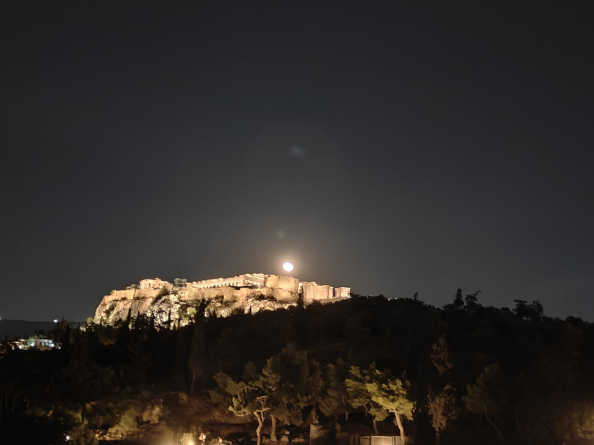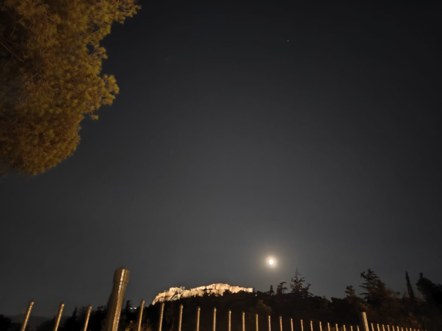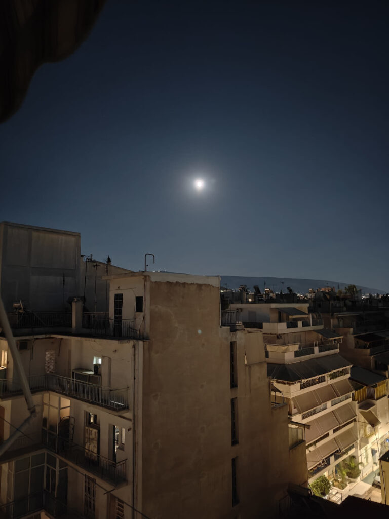 Εκεί, πάνω στον ιερό βράχο, η Ακρόπολη στέκεται επιβλητική, φωτισμένη όχι μόνο από τους τεχνητούς προβολείς, αλλά και από το ολόγιομο φως του φεγγαριού. Είναι ένα θέαμα που κόβει την ανάσα. Ο Παρθενώνας, με τις αρχαίες κολόνες του, λούζεται στο ασημένιο φως, ενώ η Πανσέληνος μοιάζει να αιωρείται ακριβώς από πάνω του, σαν ένα λαμπερό στέμμα. Οι φωτογραφίες είναι της Άννυ. Η τελευταία είναι από το πίσω μπαλκόνι του σπιτιού της στη Νισαίας…