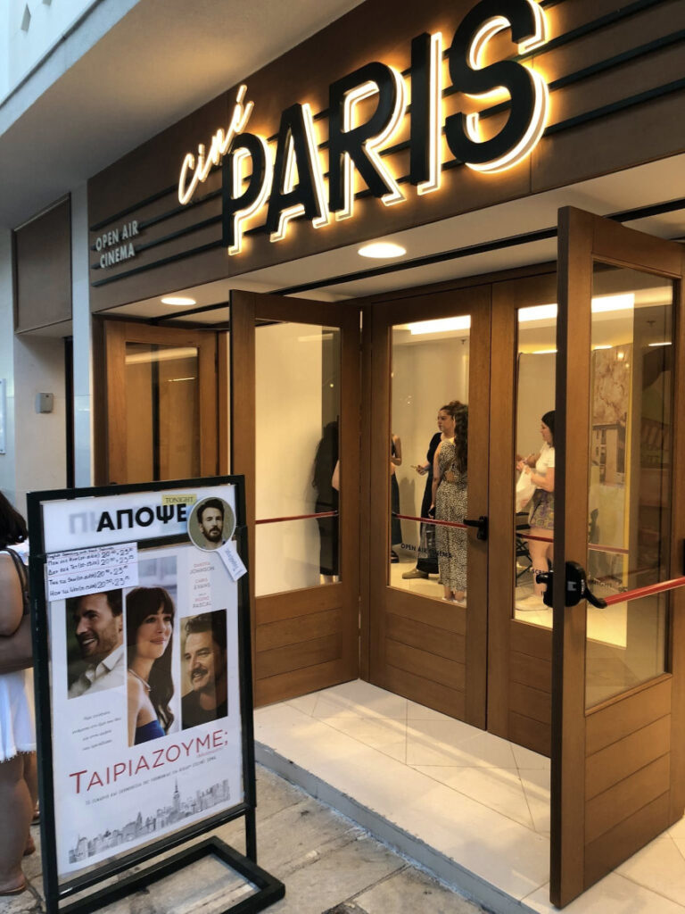 Αυτό είναι το “Cine Paris” στην Αθήνα, στην Πλάκα, ένα υπαίθριο σινεμά με θέα την Ακρόπολη. Το κτίριο διαθέτει μια κομψή είσοδο με ξύλινες πόρτες και την επιγραφή “CINE PARIS” με φωτιζόμενα γράμματα. Έξω υπάρχει μια αφίσα που διαφημίζει την ταινία, με την προβολή που είδαμε. Γνωστό το τοπίο για μας, άγνωστο για τους τουρίστες, ο υπαίθριος χώρος, όπου ο κόσμος κάθεται σε καρέκλες, παρακολουθώντας μια ταινία σε μεγάλη οθόνη. Ο χώρος είναι γεμάτος από θεατές και υπάρχει μια όμορφη θέα στον ουρανό κατά το ηλιοβασίλεμα.