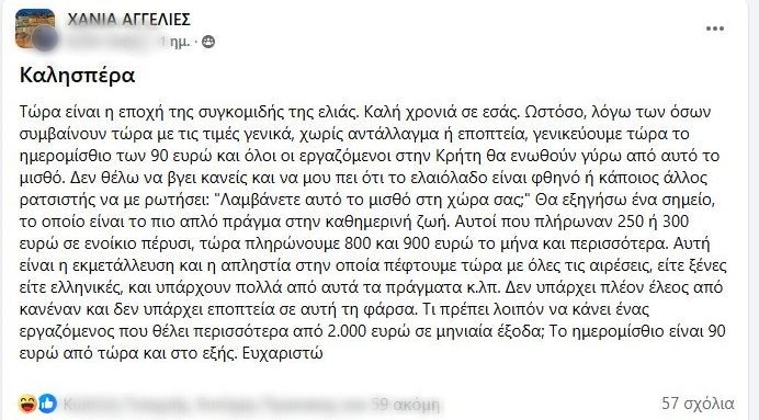 Πάνω από 57 σχόλια απέσπασε η συγκεκριμένη δημοσίευση σε κλειστή ομάδα αγγελιών. Δείτε την ανάρτηση και τα σχόλια που “οργιάζουν”: “Βάλε κάτι παραπάνω, ο νιος είναι λεβέντης…”, “δε φταις εσύ, αυτοί που σε έφεραν εδώ φταίνε”, “θα τσι μαζόξομε μόνοι μας”, ” να τσι φάνε τα πουλιά”, “σου δίνω τις ελιές και θα μου δίνεις εσύ 90 ευρώ μεροκάματο”! Όταν η λογική παραχωρεί τη θέση της στην παράνοια… Καταλαβαίνουμε ότι είναι μια δύσκολη δουλειά το μαζεμα των ελιών, αλλά όχι κι έτσι! Από το site ZARPANEWS