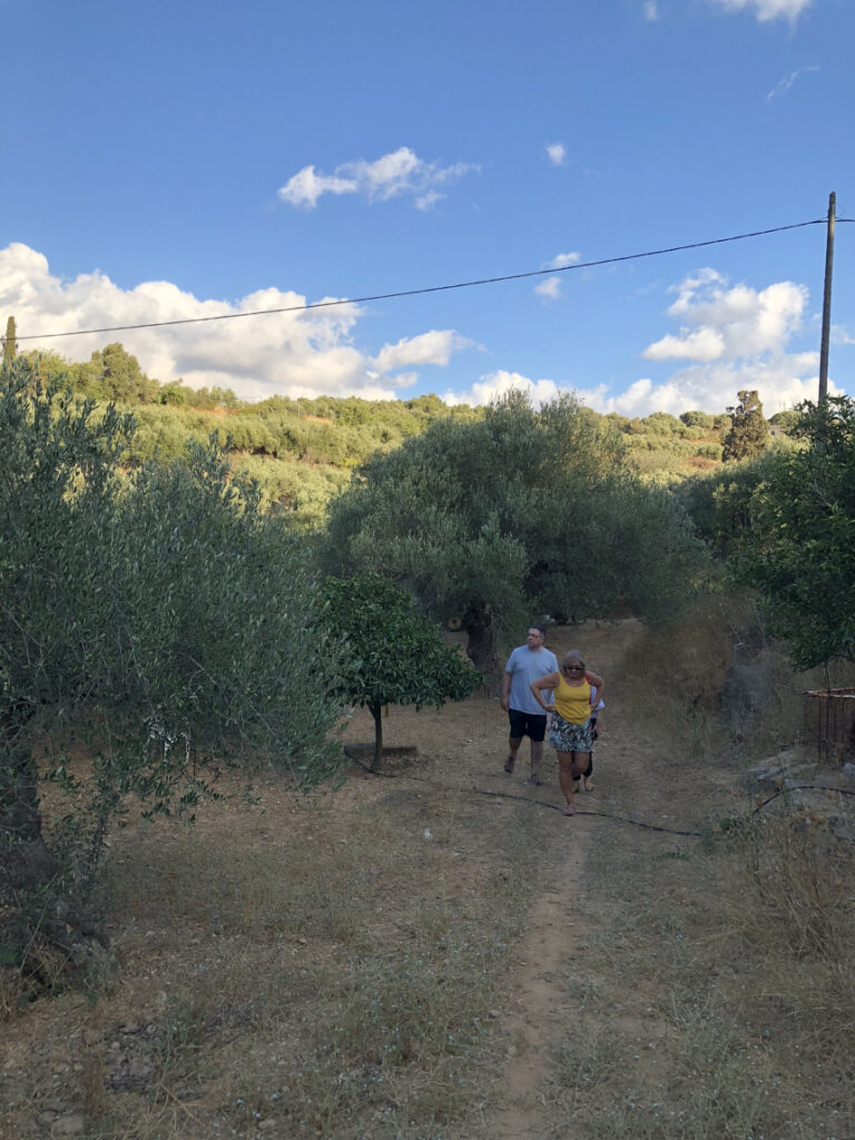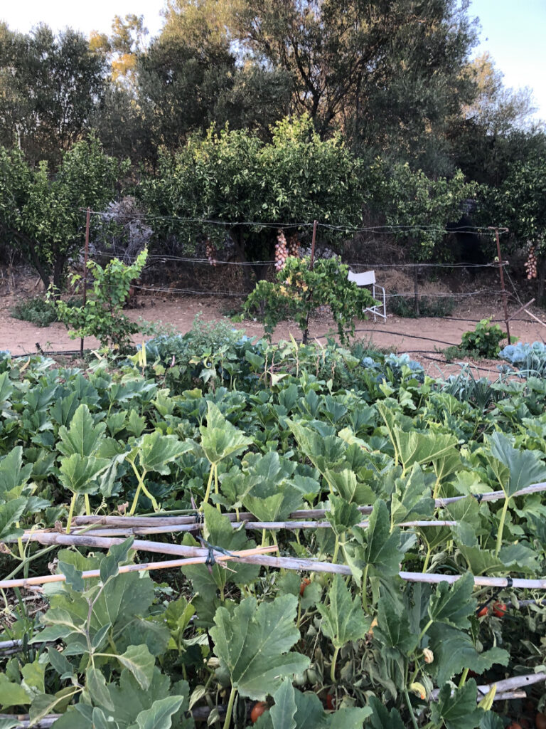 Η πρόσκληση ήρθε στο κινητό ως μήνυμα. Κι εμείς ανταποκριθήκαμε αμέσως και πήγαμε στον μικρό κήπο της Στασούλας και του Αγησίλαου στου Γρέγο, έξω από το Θραψανό, στο δρόμο για το Ηράκλειο. Ο κήπος αυτός βρίσκεται σε έναν λόφο με χωμάτινο μονοπάτι. Είναι ένας ηλιόλουστος, ρουστίκ χώρος όπου καλλιεργούνται διάφορα λαχανικά. Υπάρχει μια σειρά από ντοματιές με στρογγυλές κόκκινες και πράσινες ντομάτες να κρέμονται από αυτές, υποστηριζόμενες από ένα απλό σύστημα αναρρίχησης από ξύλινους πασσάλους και καλάμια.