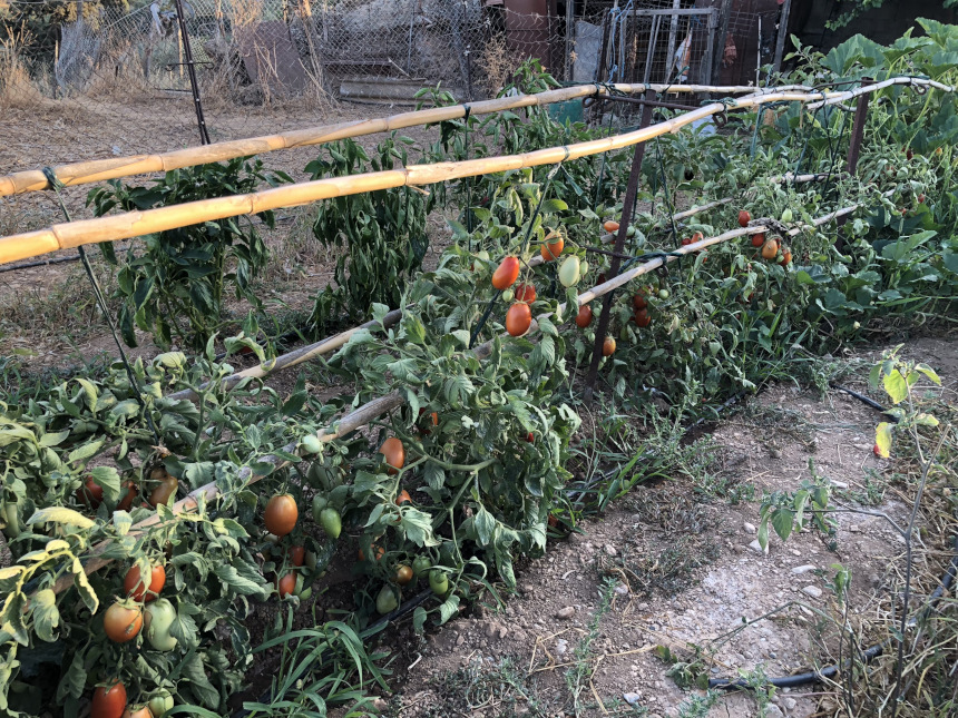 Ο κήπος έχει μια πολύ φυσική, αδούλευτη αίσθηση. Το έδαφος είναι ένα μείγμα από ξηρό χώμα και χαλαρά βότσαλα, ενώ μερικά άγρια χόρτα και φυτά αναπτύσσονται ανάμεσα στις καλλιεργημένες σειρές. Ένας απλός συρμάτινος φράχτης είναι ορατός στο βάθος, μαζί με κάτι που μοιάζει με αγροτικό εξοπλισμό, υποδηλώνοντας μια ενεργή γεωργική περιοχή. Η εικόνα αποτυπώνει έναν γοητευτικό, λειτουργικό κήπο που προσφέρει μια πλούσια συγκομιδή, χρησιμοποιώντας πρακτικές, παραδοσιακές μεθόδους.
