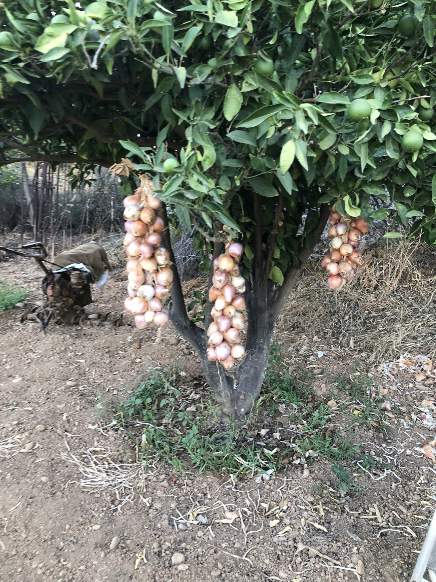Τα φυτά φαίνονται υγιή και γεμάτα καρπούς, υποδηλώνοντας μια επιτυχημένη συγκομιδή. Κοντά, ένα μικρό εσπεριδοειδές δέντρο χρησιμοποιείται για αποθήκευση. Κρεμασμένες από τα κλαδιά του, υπάρχουν όμορφες πλεξούδες από φρεσκοκομμένα κρεμμύδια. Αυτή είναι μια παραδοσιακή μέθοδος για την αποξήρανση και αποθήκευση των κρεμμυδιών σε έναν ξηρό, καλά αεριζόμενο χώρο, βοηθώντας τα να διατηρηθούν για πολλούς μήνες.
