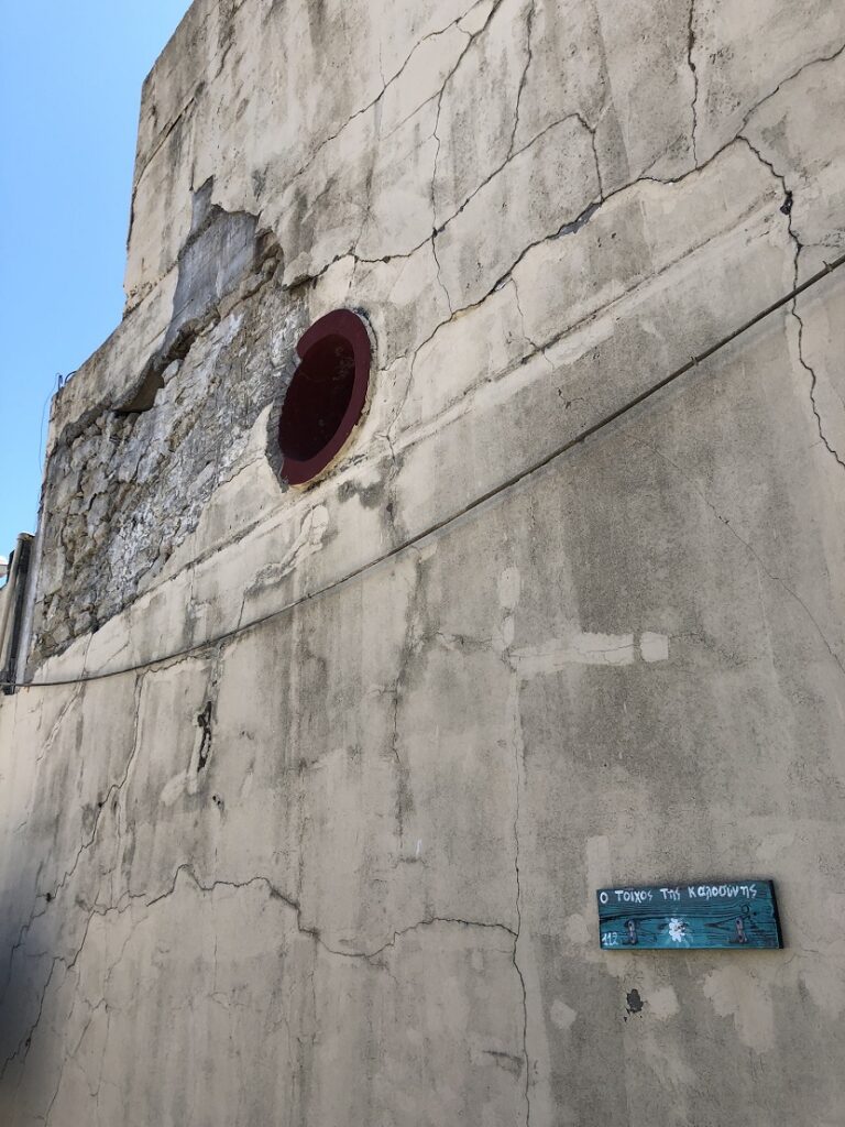 Απέναντι ακριβώς υπάρχει αυτός ο τοίχος… Ένας παλιός, φθαρμένος τοίχος με ρωγμές και ένα στρογγυλό άνοιγμα. Στο κάτω δεξί μέρος υπάρχει μια μικρή πινακίδα που γράφει: «Ο ΤΟΙΧΟΣ ΤΗΣ ΚΑΛΟΣΥΝΗΣ». Ίσως να είναι ένα καλλιτεχνικό ή συμβολικό σχόλιο· ίσως ένας τρόπος να δοθεί στον τοίχο μια «ιστορία» ή μια ξεχωριστή ταυτότητα, παρά την εγκατάλειψη και τις φθορές του.