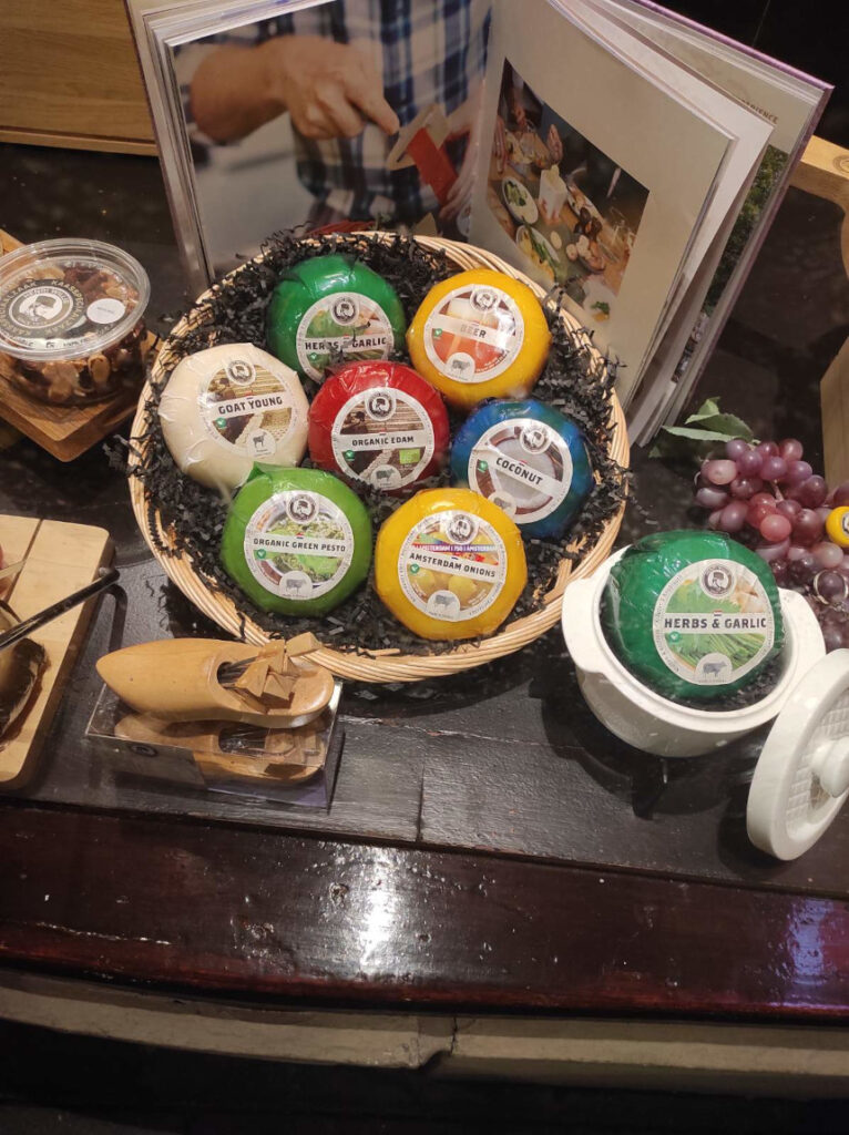 Αυτά τα στρογγυλά κεφάλια, κυρίως Gouda –το εμβληματικό ολλανδικό τυρί–, είναι σύμβολα πλούτου και γεωργικής ευημερίας, έτοιμα να ωριμάσουν και να ταξιδέψουν σε όλο τον κόσμο. Η τέλεια στοίβαξή τους αντικατοπτρίζει την ολλανδική τάξη, ενώ το βαθύ κίτρινο χρώμα τους (από το κερί ή την παραφίνη) σε κάνει να νιώθεις ότι βρίσκεσαι μπροστά σε έναν «τοίχο από χρυσάφι». Όμως, το ολλανδικό τυρί έχει εξελιχθεί. Αν παρατηρήσεις το καλάθι στη βιτρίνα, θα δεις ότι δίπλα στα κλασικά τυριά, φιλοξενούνται μικρότερα κεφάλια σε απίθανα χρώματα και γεύσεις. Αυτή είναι η σύγχρονη όψη του Ολλανδικού τυροκομείου.