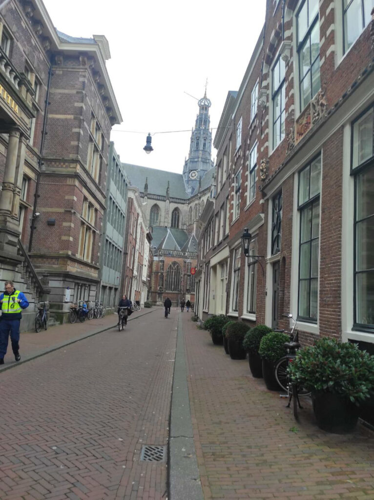 Οι ψηλές, επιβλητικές προσόψεις των κτιρίων, με τα μεγάλα παράθυρα, σε οδηγούν φυσικά προς το επίκεντρο: την Grote Markt (Μεγάλη Αγορά) και τον μεγαλοπρεπή ναό Grote Kerk (ή St. Bavokerk). Ο πύργος του ναού, που δεσπόζει στο βάθος της εικόνας, είναι το απόλυτο ορόσημο. Είναι εκείνος ο γοτθικός γίγαντας που βλέπεις πάνω από τις στέγες, υπενθυμίζοντας συνεχώς την αίγλη του παρελθόντος. Παρατηρήστε τους ντόπιους να κυκλοφορούν με τα ποδήλατά τους, επιβεβαιώνοντας πως εδώ ο χρόνος κυλάει σε πιο χαλαρούς ρυθμούς από τον πολύβουο γείτονά της.