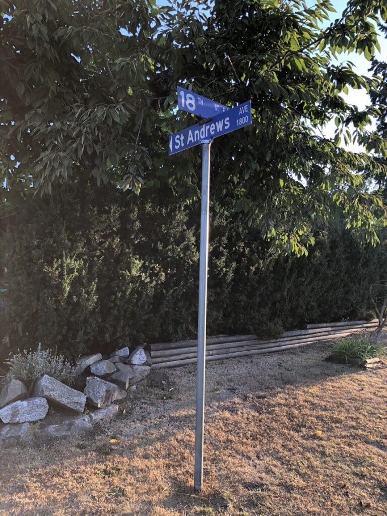 Οι δύο αυτές εικόνες, παρμένες στις πρωινές σας βόλτες, συνδυάζουν τέλεια την αίσθηση μιας ήσυχης, οικιστικής γειτονιάς με την δύναμη και την ομορφιά της τοπικής βλάστησης. Η πρώτη φωτογραφία, με τη χαρακτηριστική πινακίδα των δρόμων 18th St E Ave και St Andrews Ave, αιχμαλωτίζει μια στιγμή από την καθημερινή ζωή του North Vancouver. Η μπλε πινακίδα είναι άμεσα αναγνωρίσιμη και παρέχει μια σταθερή, δομημένη αναφορά στο περιβάλλον. Το νούμερο 1800 στην 18th Ave πιθανότατα σηματοδοτεί τον αριθμό οικοδομικού τετραγώνου, μια συνηθισμένη πρακτική στην Βόρεια Αμερική.