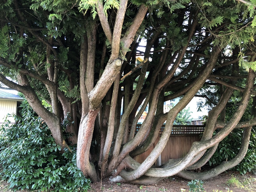 Η δεύτερη φωτογραφία είναι πραγματικά εντυπωσιακή και αποτελεί έναν ύμνο στην άγρια φύση που εισχωρεί μέχρι και τις αυλές των σπιτιών. Το δέντρο αυτό, που με βάση το φλοιό του και τα χαρακτηριστικά του κλαδιά μοιάζει πολύ με Western Red Cedar (Κόκκινη Κέδρος της Δύσης) ή κάποιο άλλο είδος Κυπαρισσιού (όπως το Yellow Cedar), είναι ένα γλυπτό της φύσης. Τα πολλά, στριμμένα και παχιά κλαδιά που ξεκινούν χαμηλά από τη βάση, δίνουν την αίσθηση ενός αρχαίου και ανθεκτικού οργανισμού. Είναι ένα από τα πιο εμβληματικά δέντρα. Η ανάπτυξη του συγκεκριμένου δέντρου, με τα κλαδιά του να απλώνονται, δημιουργεί ένα φυσικό καταφύγιο και μια οπτική δήλωση της πλούσιας υγρασίας και της γονιμότητας του εδάφους.