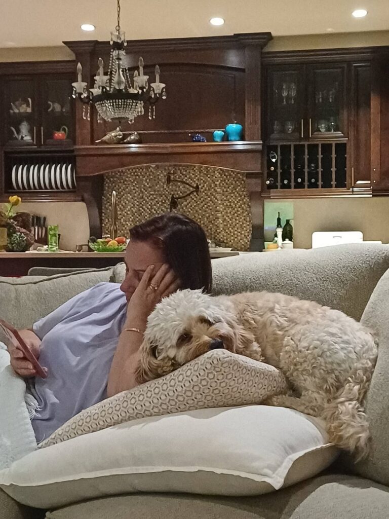Εδώ κουλουριασμένη στον καναπέ, με το κεφάλι της πάνω στο μαξιλάρι, δείχνοντας πόσο της αρέσει η χαλάρωση και η ζεστασιά, δίπλα στον άνθρωπό της, τη “μαμά” της, Έστερ. Λένε, πως τα σκυλιά αγαπούν πιστά. Αυτό που νιώσαμε εμείς, το καθιστά απόλυτη αληθινό και… κάτι παραπάνω. Τόσα πλούσια αισθήματα από ένα ζωάκι! Σκεφτείτε έναν καιρό που θα είναι έτσι ο κόσμος, θα είναι σίγουρα, πολύ καλύτερος!