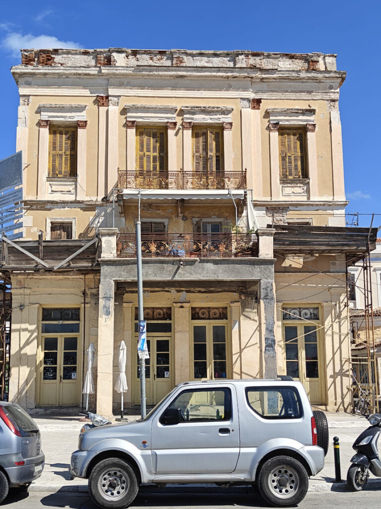 Και μετά, το παράθυρο… Οι ξύλινες περσίδες, μισάνοιχτες, ίσα που αφήνουν το φως να μπει, αποκαλύπτοντας το χάος: σκουπίδια, σκόνη, και η μαύρη τρύπα ενός εσωτερικού χώρου. Εκεί μέσα, το φως πεθαίνει. Τι έκανε άραγε τους ενοίκους να φύγουν; Σε τέτοια κτίρια, η απάντηση δεν είναι ποτέ μία. Ίσως ήταν η κληρονομιά που έγινε βάρος. Ίσως ήταν ο σεισμός που άφησε σημάδια και φόβο. Ίσως ήταν η οικονομική κρίση που έκανε ασύμφορη την επισκευή. Ή ίσως, και εδώ κρύβεται η ποίηση, ήταν μια ιστορία πιο προσωπική.