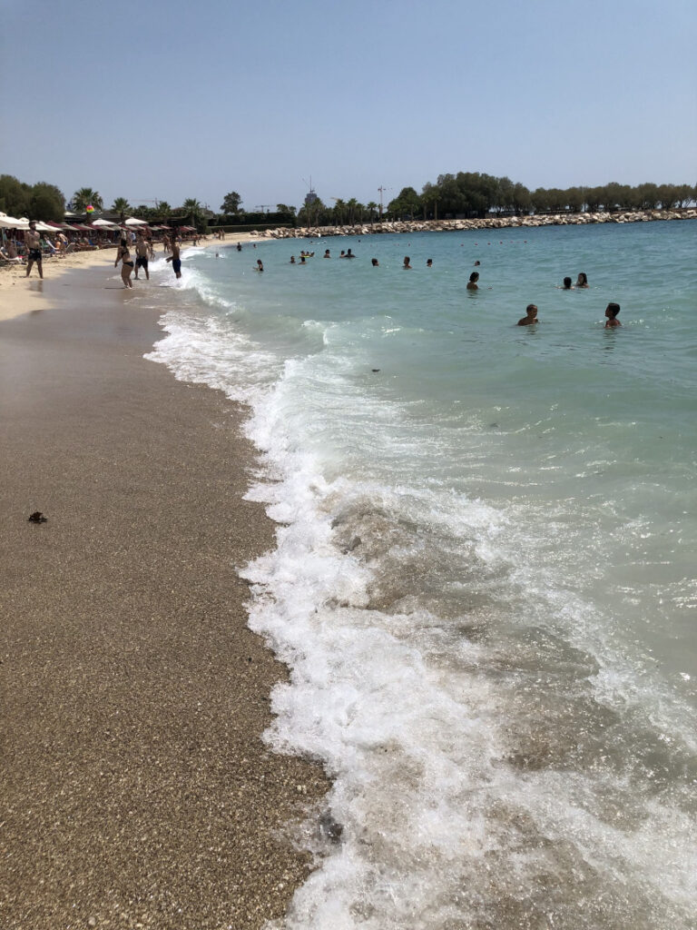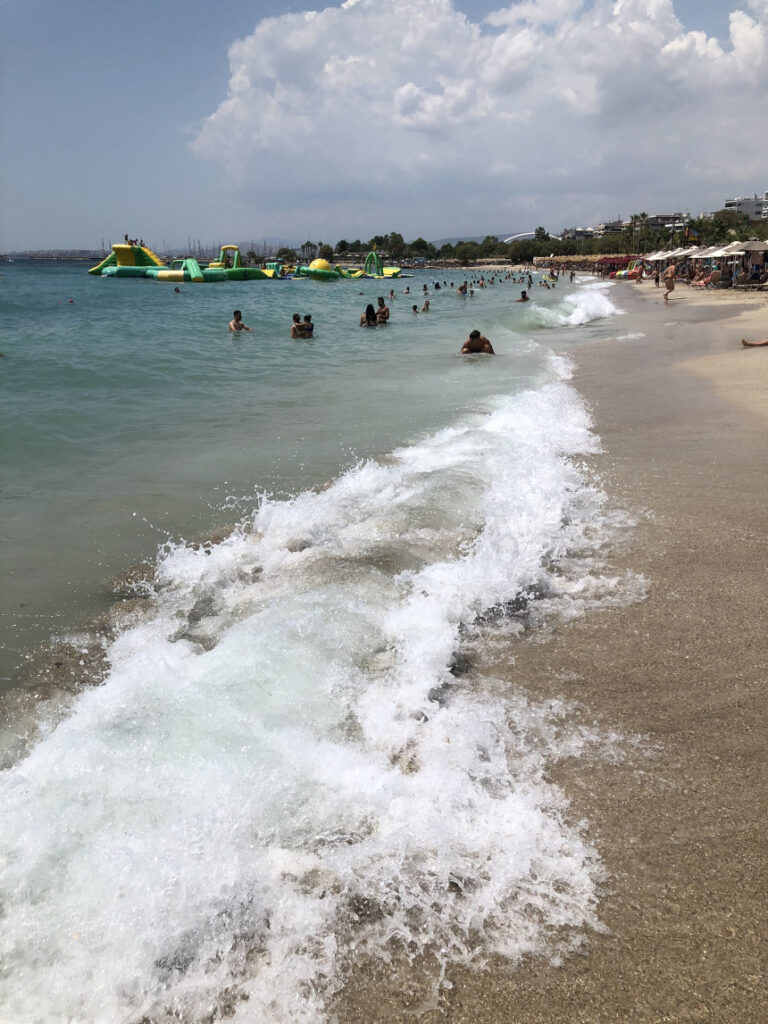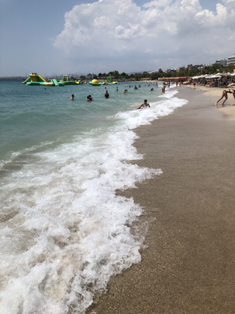 Στο βάθος, τα πολύχρωμα φουσκωτά στη θάλασσα δημιουργούν ένα σκηνικό παιχνιδιού και ανεμελιάς — μικροί και μεγάλοι σκαρφαλώνουν, γελούν, βουτάνε. Η θάλασσα είναι δροσερή, με κύματα που φτάνουν απαλά στην ακτή και αφρίζουν πάνω στην υγρή άμμο. Μπαίνεις στο νερό και αισθάνεσαι την ένταση της πόλης να ξεπλένεται. Το φως του ήλιου αντανακλά πάνω στο νερό, τυφλώνει γλυκά, και όλα μοιάζουν λίγο πιο ήρεμα, λίγο πιο όμορφα.