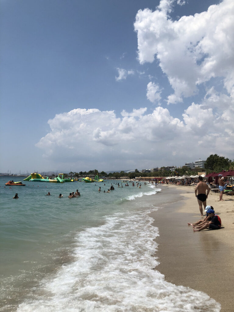 Με τη Άννυ τη Σούλα και την Κριστίν πήγαμε χθες το μεσημέρι στην Ακτή του Ήλιου στον Άλιμο. Είναι ιδιαίτερα δημοφιλής για τα καθαρά νερά της και τις οργανωμένες παροχές, όπως φαίνεται και στη φωτογραφία με τα φουσκωτά παιχνίδια στη θάλασσα. Παρά το σύννεφο που φαίνεται στον ορίζοντα να απειλεί με καταιγίδα, η παραλία ήταν γεμάτη ζωή και κόσμο που απολάμβανε τη θάλασσα.