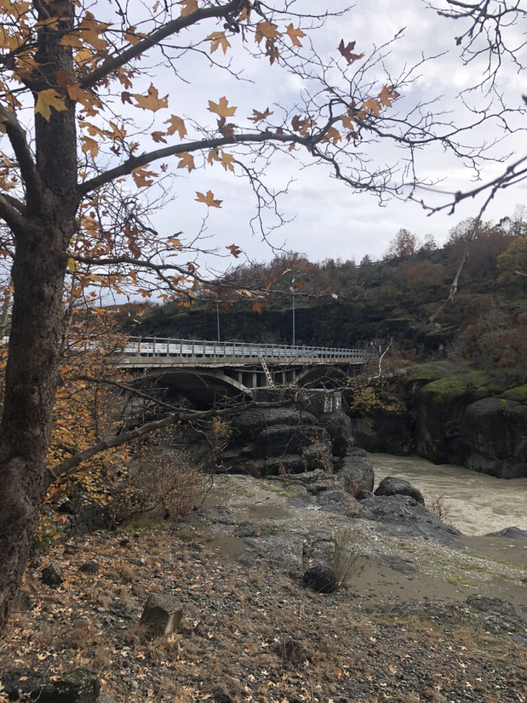 Παρατηρώντας το τοπίο, δεν μπορούσαμε να αγνοήσουμε την ανθρώπινη παρουσία που συνδέει τις δύο πλευρές του ποταμού: τη σύγχρονη γέφυρα που δέσποζε πάνω από το φαράγγι. Αυτή η κατασκευή αποτελεί μια υπενθύμιση του τρόπου με τον οποίο ο άνθρωπος προσπαθεί να δαμάσει και να ενσωματωθεί στη φύση, χωρίς όμως να μειώνει την άγρια ομορφιά της.