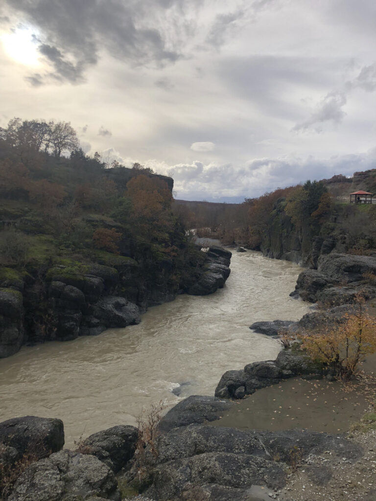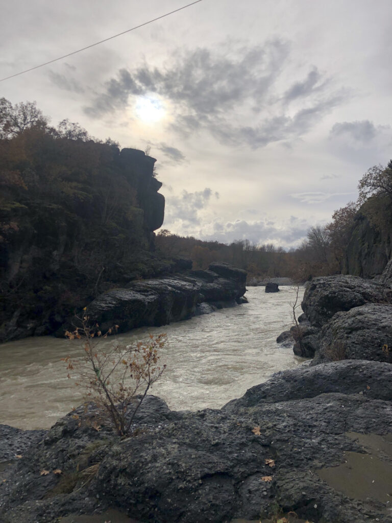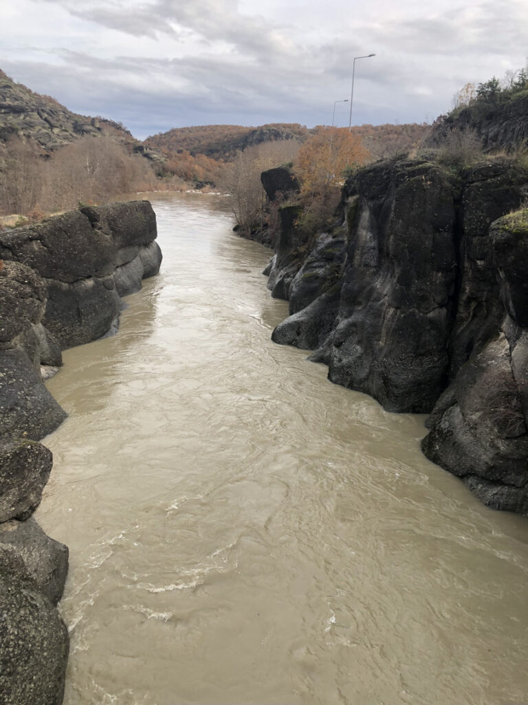 Το ποτάμι έρεε ορμητικά μέσα από τα στενά περάσματα, σχηματίζοντας ένα εντυπωσιακό μικρό φαράγγι ανάμεσα στα σκοτεινά, βραχώδη τοιχώματα. Τα επιβλητικά βράχια στις όχθες, σκαλισμένα από τον χρόνο και τη ροή του νερού, αποτελούν ένα μοναδικό γεωλογικό φαινόμενο. Η αντίθεση ανάμεσα στο γκρίζο των πετρωμάτων και το καφέ-κιτρινωπό χρώμα του νερού δημιουργούσε ένα δραματικό σκηνικό.