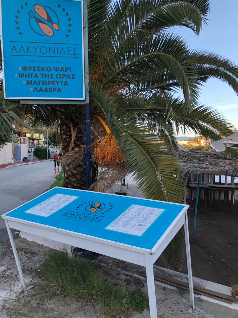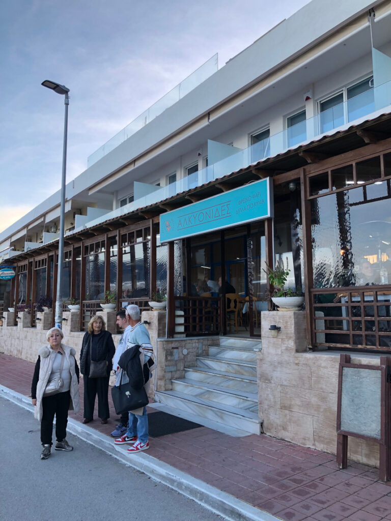 Η ταβέρνα, με τη χαρακτηριστική της ξύλινη επένδυση και τους μεγάλους υαλοπίνακες, βρίσκεται ακριβώς δίπλα στη θάλασσα του Σαρωνικού, προσφέροντας μια υπέροχη ατμόσφαιρα. Η φωτεινή μπλε επιγραφή με το όνομα “Αλκυονίδες” και το μενού που ανακοινώνει «Φρέσκο Ψάρι, Ψητά της Ώρας, Μαγειρευτά, Λαδερά» μας έβαλε αμέσως στο κλίμα της ελληνικής κουζίνας. Από την πρώτη μπουκιά, καταλάβαμε πως η επιλογή των διοργανωτών ήταν πέρα για πέρα επιτυχημένη.