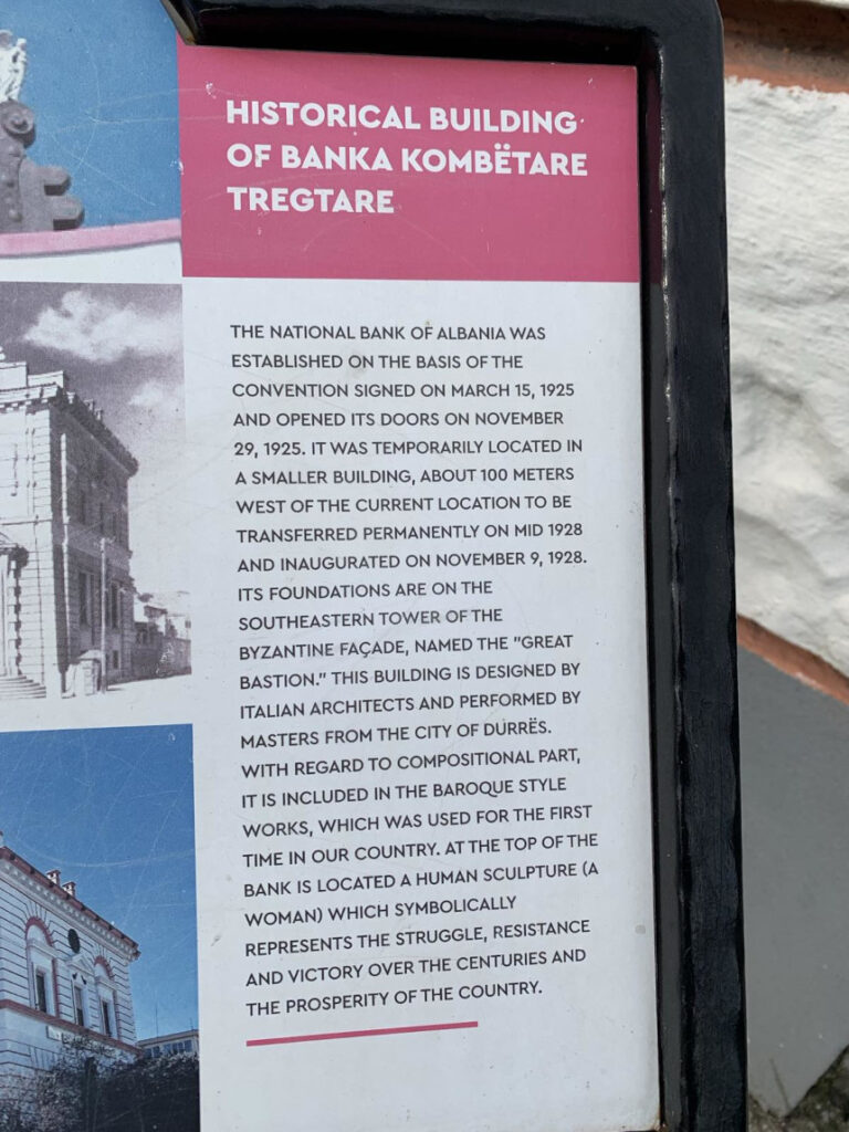 Από την πινακίδα που είναι δίπλα στο κτίρο, προκύπτουν ορισμένα πολύ ενδιαφέροντα ιστορικά στοιχεία για το κτίριο της Εθνικής Εμπορικής Τράπεζας (Banka Kombëtare Tregtare) στο Δυρράχιο που αξίζει να γνωρίζετε: Ίσως το πιο εντυπωσιακό στοιχείο είναι ότι τα θεμέλια του κτιρίου βρίσκονται πάνω στον νοτιοανατολικό πύργο της βυζαντινής οχύρωσης, ο οποίος ονομαζόταν «Μεγάλος Προμαχώνας» (Great Bastion). Το κτίριο είναι σχεδιασμένο σε στυλ Μπαρόκ (Baroque). Σύμφωνα με την πινακίδα, ήταν η πρώτη φορά που χρησιμοποιήθηκε αυτός ο αρχιτεκτονικός ρυθμός στην Αλβανία.