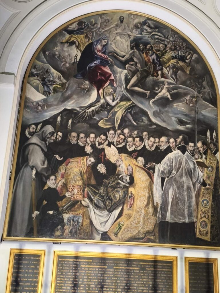 Στο κάτω μέρος, η κηδεία του ευεργέτη κόμη, περιτριγυρισμένη από τις μορφές των ευγενών της εποχής με τα χαρακτηριστικά λευκά περιλαίμια. Στο πάνω μέρος, μια έκρηξη φωτός και πνευματικότητας, όπου η ψυχή του κόμη οδηγείται προς τον Χριστό και την Παναγία. Είναι συγκλονιστικό να βλέπεις από κοντά τις επιμήκεις μορφές και τα απόκοσμα χρώματα που έκαναν τον Ελ Γκρέκο να θεωρείται αιώνες μπροστά από την εποχή του.
