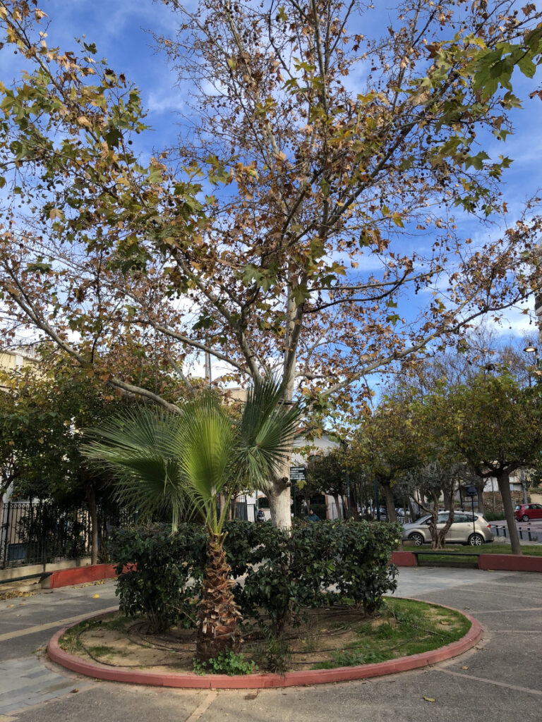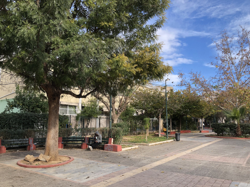 Τα δέντρα, ντυμένα με τα χρώματα της εποχής —άλλοτε με το βαθύ πράσινο της ακακίας και άλλοτε με τα χρυσαφένια, ξηρά φύλλα του πλατάνου— δημιουργούν ένα φυσικό καταφύγιο από τον θόρυβο της πόλης. Στα κόκκινα και πράσινα παγκάκια της πλατείας, η καθημερινότητα παίρνει μια ανάσα: Ένας περαστικός απολαμβάνει τη σιωπή κάτω από τη σκιά. Οι φυλλωσιές που γυμνώνονται σιγά-σιγά προμηνύουν τον χειμώνα, αλλά η λιακάδα θυμίζει πως στην Αθήνα το φως δεν λείπει ποτέ.