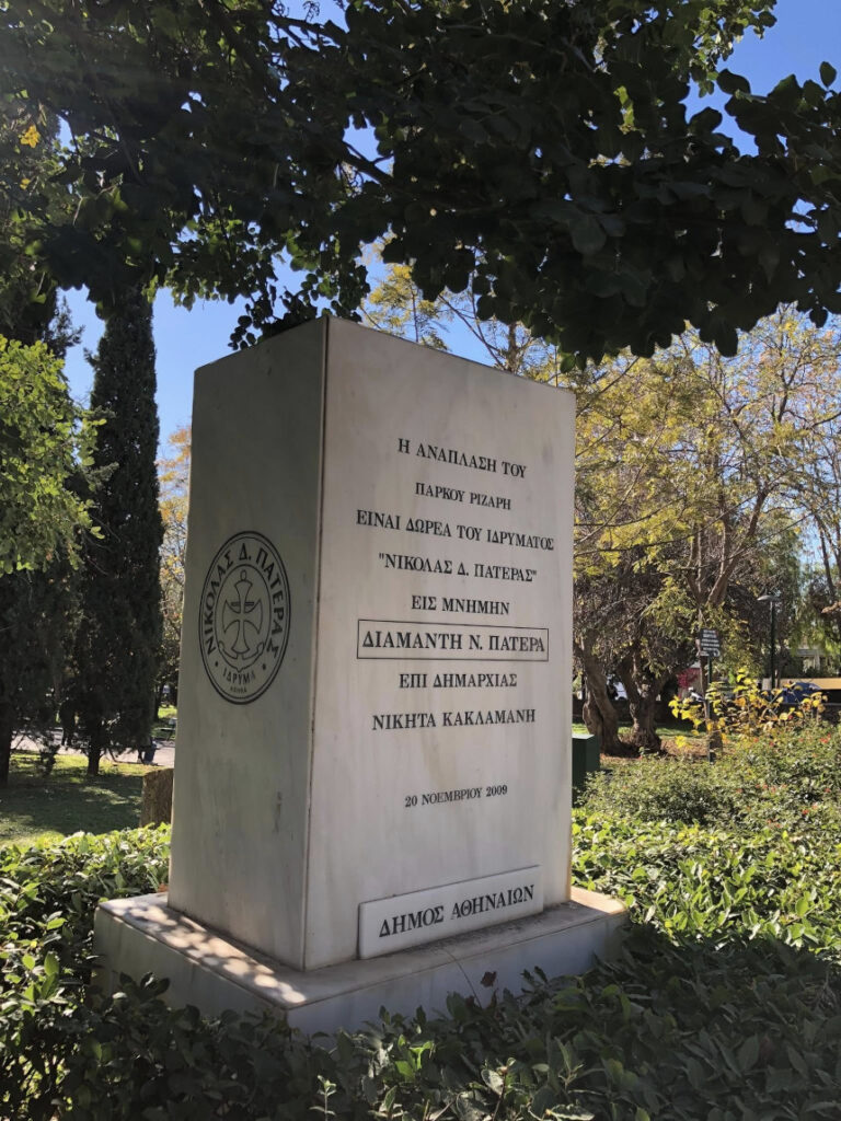 Όπως μαρτυρά και η μαρμάρινη στήλη στην είσοδο, η ανάπλαση αυτή είναι καρπός της ευγενικής προσφοράς του Ιδρύματος «Νικόλας Δ. Πατέρας», εις μνήμην του Διαμαντή Ν. Πατέρα. Η υλοποίηση αυτή έγινε επί δημαρχίας Νικήτα Κακλαμάνη και παραδόθηκε στους Αθηναίους τον Νοέμβριο του 2009. Είναι πραγματικά ελπιδοφόρο και συγκινητικό να βλέπουμε τέτοιες ιδιωτικές πρωτοβουλίες και χορηγίες να μεταμορφώνουν την καθημερινότητα των δημοτών.