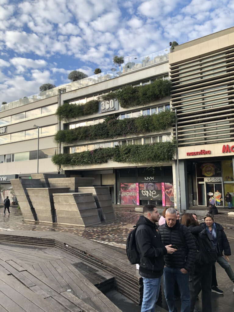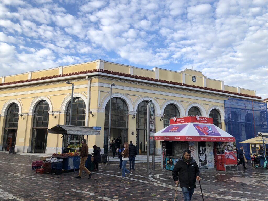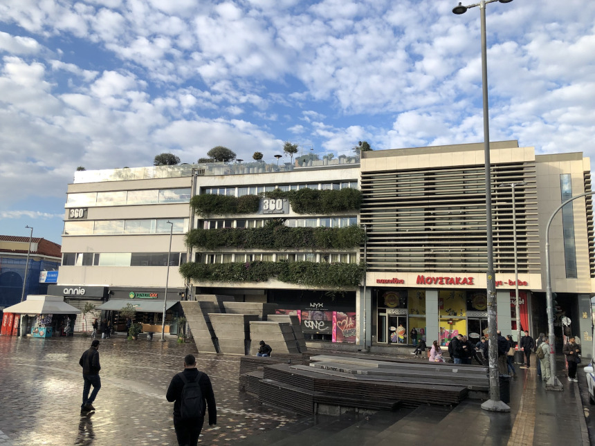 Το νεοκλασικό κτίριο του σταθμού, με τις χαρακτηριστικές καμάρες του, στέκει ως πύλη που ενώνει το παρελθόν με το παρόν. Το σύγχρονο κτίριο “360”, με τους κάθετους κήπους και την πράσινη ανάσα στα μπαλκόνια του, δίνει μια νότα φρεσκάδας στο γκρίζο του τσιμέντου. Ακόμα και οι κλειστές μεταλλικές πόρτες με τα graffiti και τα καταστήματα παιχνιδιών, όπως ο «Μουστάκας», προσθέτουν τις δικές τους πινελιές στην καθημερινότητα της πλατείας. Οι πάγκοι με τα φρούτα και τα κόκκινα περίπτερα παραμένουν οι σταθερές αξίες, έτοιμες να εξυπηρετήσουν όσους αψηφούν το κρύο για μια βόλτα στο κέντρο.