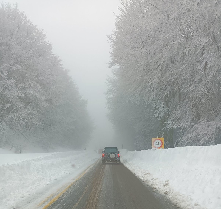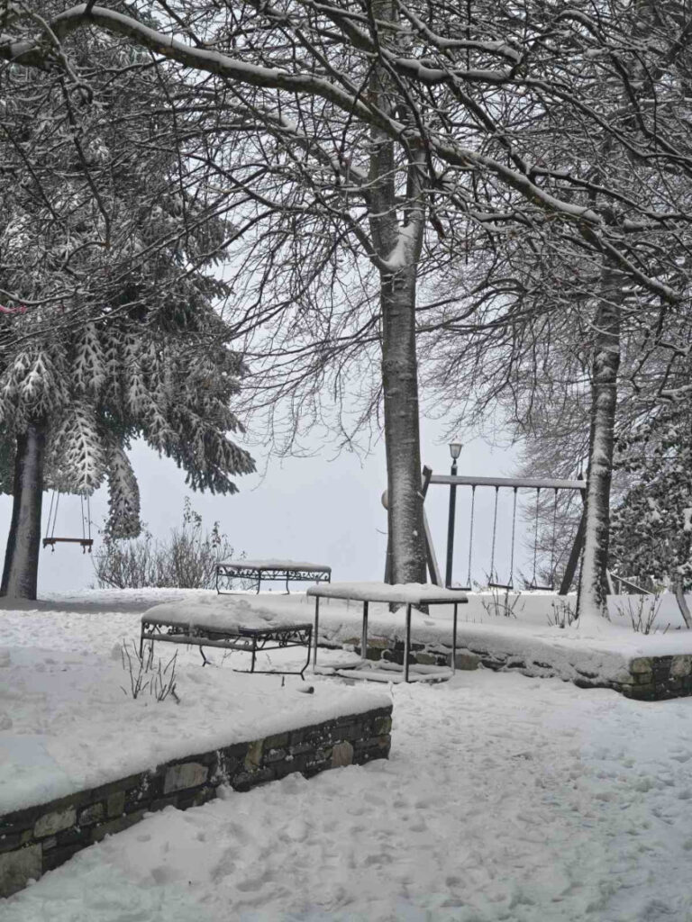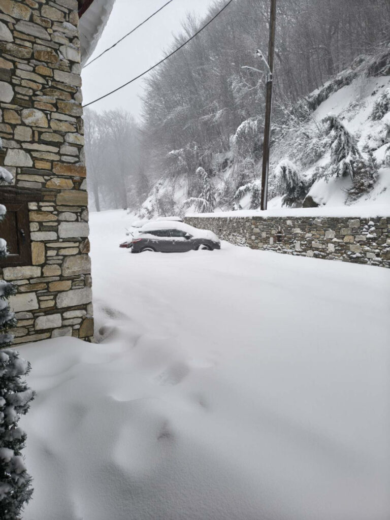 Στον εξωτερικό χώρο, οι κούνιες και τα παγκάκια έχουν ακινητοποιηθεί στον χρόνο. Τα δέντρα, «στολισμένα» με πυκνό χιόνι, σκύβουν προστατευτικά πάνω από το τοπίο, δημιουργώντας μια ατμόσφαιρα απόλυτης ηρεμίας. Είναι από εκείνες τις στιγμές που η σιωπή του βουνού γίνεται ο πιο όμορφος ήχος. Και οι δρόμοι θέλουν προσοχή γιατί ο πάγος γλιστράει…
