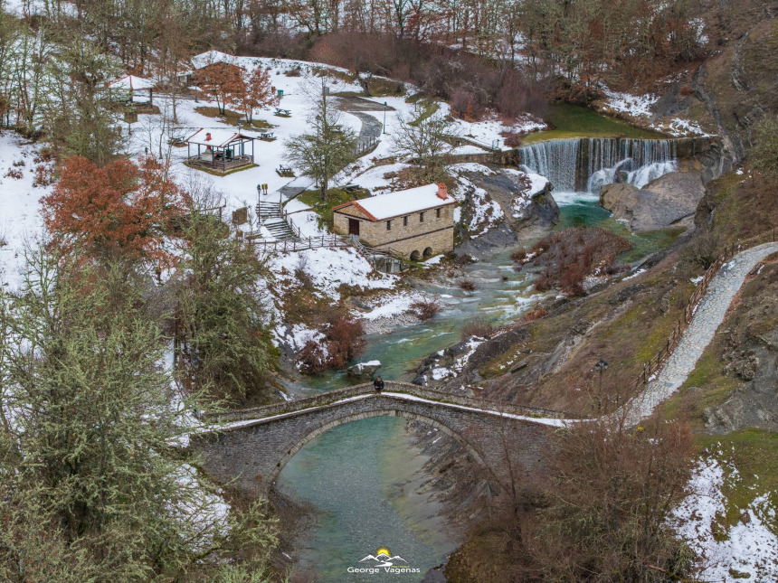 Το κεντρικό σημείο αναφοράς, το μονότοξο πέτρινο γεφύρι, στέκει αγέρωχο πάνω από τα κρυστάλλινα νερά, θυμίζοντάς μας την τέχνη των παλιών μαστόρων της πέτρας. Δίπλα του, ο παραδοσιακός νερόμυλος με την κόκκινη κεραμοσκεπή συμπληρώνει το σκηνικό, δημιουργώντας μια εικόνα απόλυτης γαλήνης.