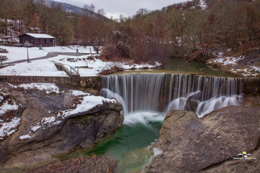 Το χιονισμένο μονοπάτι μας οδηγεί στον εντυπωσιακό τεχνητό καταρράκτη, που με την ορμή του σπάει τη σιωπή του παγωμένου δάσους. Τα τιρκουάζ νερά του ποταμού έρχονται σε υπέροχη αντίθεση με το λευκό του χιονιού και τις γήινες αποχρώσεις των γυμνών δέντρων.
