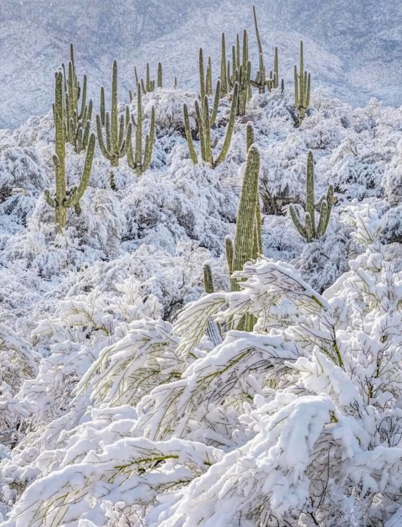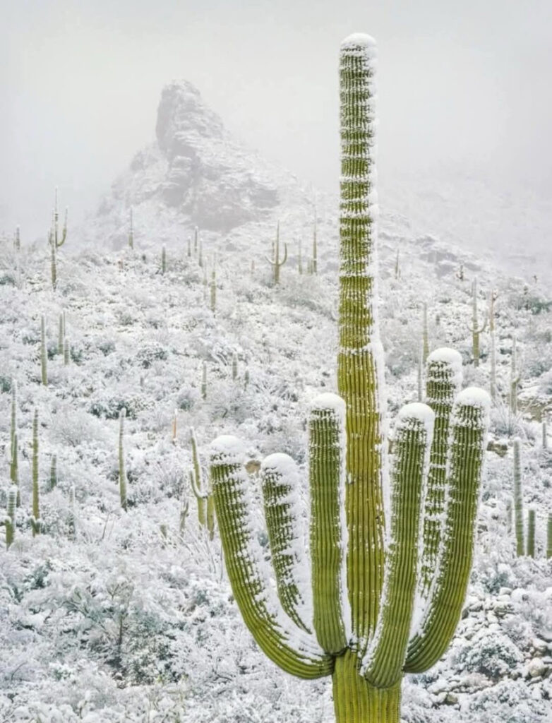 Ο βραβευμένος φωτογράφος Jack Dykinga κατάφερε να απαθανατίσει αυτή τη σπάνια σύγκρουση των στοιχείων της φύσης. Στις φωτογραφίες του, οι λεπτομέρειες είναι συγκλονιστικές. Η αντίθεση των χρωμάτων. Το έντονο πράσινο των κάκτων ξεπροβάλλει μέσα από το παχύ στρώμα χιονιού. Η γεωμετρία της φύσης. Το χιόνι τονίζει τις «νευρώσεις» των Saguaro, μετατρέποντάς τους σε φυσικά γλυπτά. Το απόκοσμο φως. Ο συννεφιασμένος ουρανός πάνω από τα χιονισμένα βουνά της Αριζόνα δημιουργεί μια ατμόσφαιρα που μοιάζει με πίνακα ζωγραφικής.