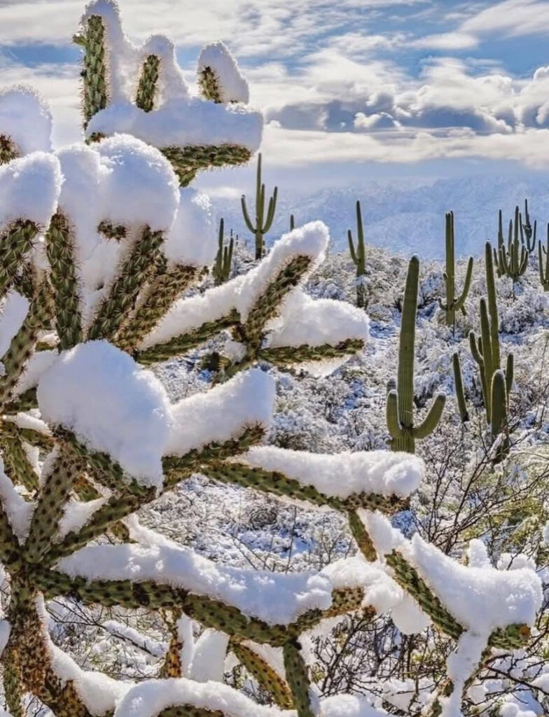 Η έρημος Sonoran στην Αριζόνα είναι παγκοσμίως γνωστή για τις υψηλές θερμοκρασίες της, το άνυδρο τοπίο και τους εμβληματικούς κάκτους Saguaro που υψώνονται σαν γίγαντες κάτω από τον καυτό ήλιο. Ωστόσο, οι πρόσφατες εικόνες που κάνουν τον γύρο του διαδικτύου παρουσιάζουν κάτι εντελώς διαφορετικό: μια έρημο μεταμορφωμένη σε ένα απέραντο, λευκό τοπίο. Το κύμα κακοκαιρίας που έπληξε τις Ηνωμένες Πολιτείες δεν έκανε εξαιρέσεις, φτάνοντας μέχρι τις νοτιοδυτικές πολιτείες και προσφέροντας ένα θέαμα που θυμίζει περισσότερο Αλπικό τοπίο παρά την άγρια δύση. Το χιόνι κάλυψε τους κάκτους και τους αμμόλοφους, δημιουργώντας μια απόκοσμη αλλά πανέμορφη γαλήνη.