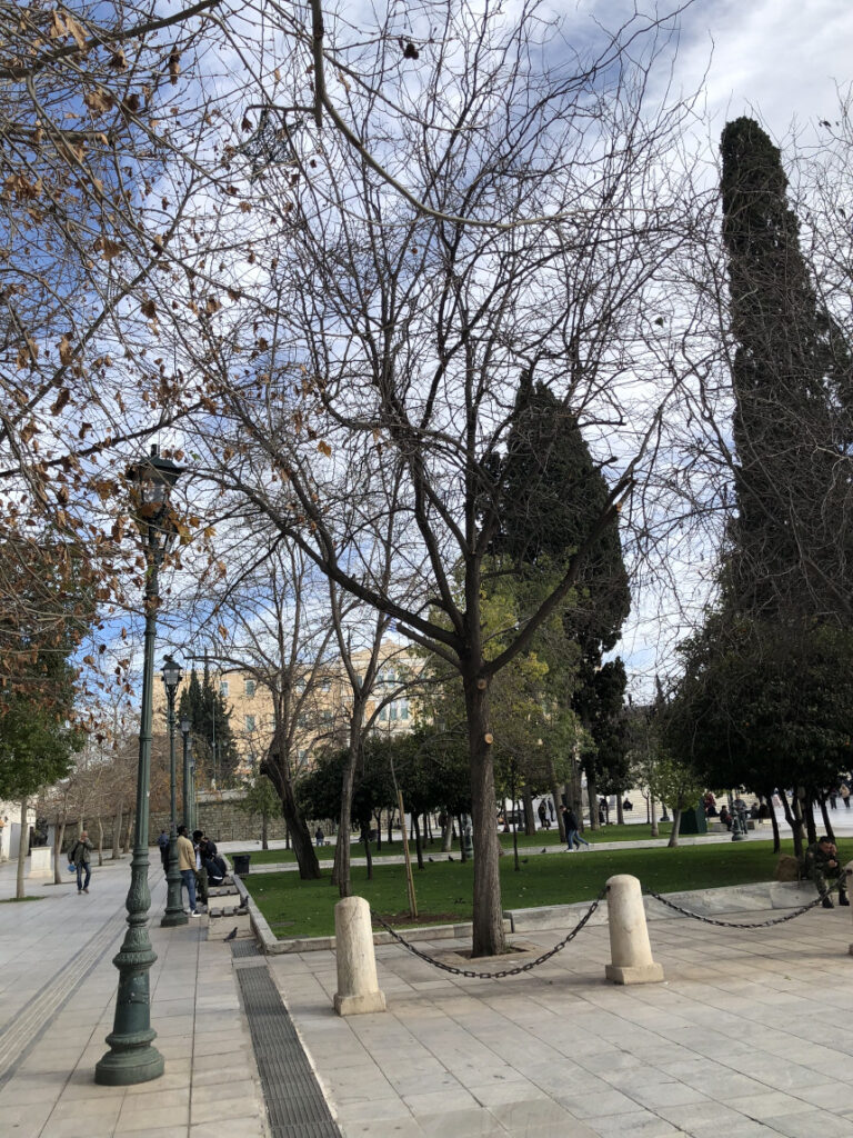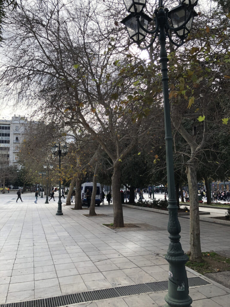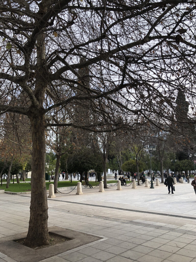 Τον χειμώνα, η «κάτω» πλατεία μεταμορφώνεται. Τα δέντρα, γυμνά πια από φύλλα, επιτρέπουν στο αττικό φως να λούσει το μάρμαρο, αποκαλύπτοντας μια πιο «γυμνή», σχεδόν δωρική όψη του κέντρου. Οι ρυθμοί μπορεί να φαίνονται πιο βιαστικοί κάτω από τον συννεφιασμένο ουρανό, όμως η κίνηση δεν σταματά ποτέ.