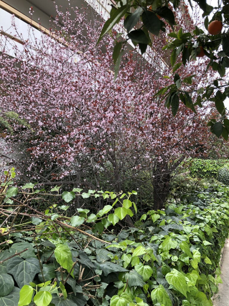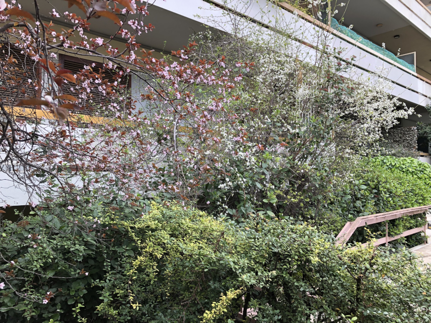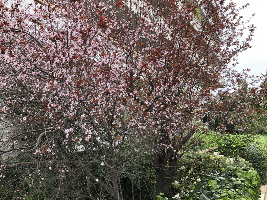 Τα ανθισμένα δέντρα, ντυμένα στα ροζ και στα λευκά, στέκονται σαν αθόρυβοι μάρτυρες μιας αλλαγής που δεν μπορεί να σταματήσει κανένα κρύο. Είναι εντυπωσιακό το πώς το έντονο μωβ-κόκκινο των φύλλων της καλλωπιστικής δαμασκηνιάς έρχεται σε αντίθεση με το γκρίζο του ουρανού, δίνοντας χρώμα στην καθημερινότητά μας. Δίπλα τους, οι λευκές ανθισμένες κορυφές ξεπροβάλλουν πάνω από τους καταπράσινους φράχτες και τον κισσό.