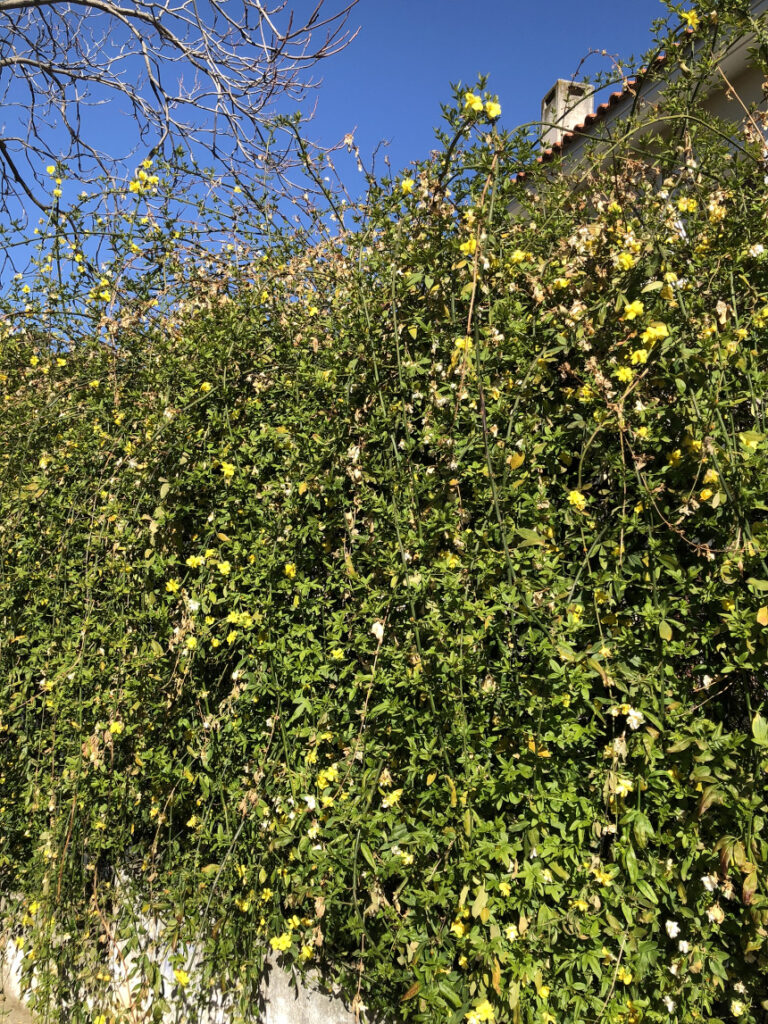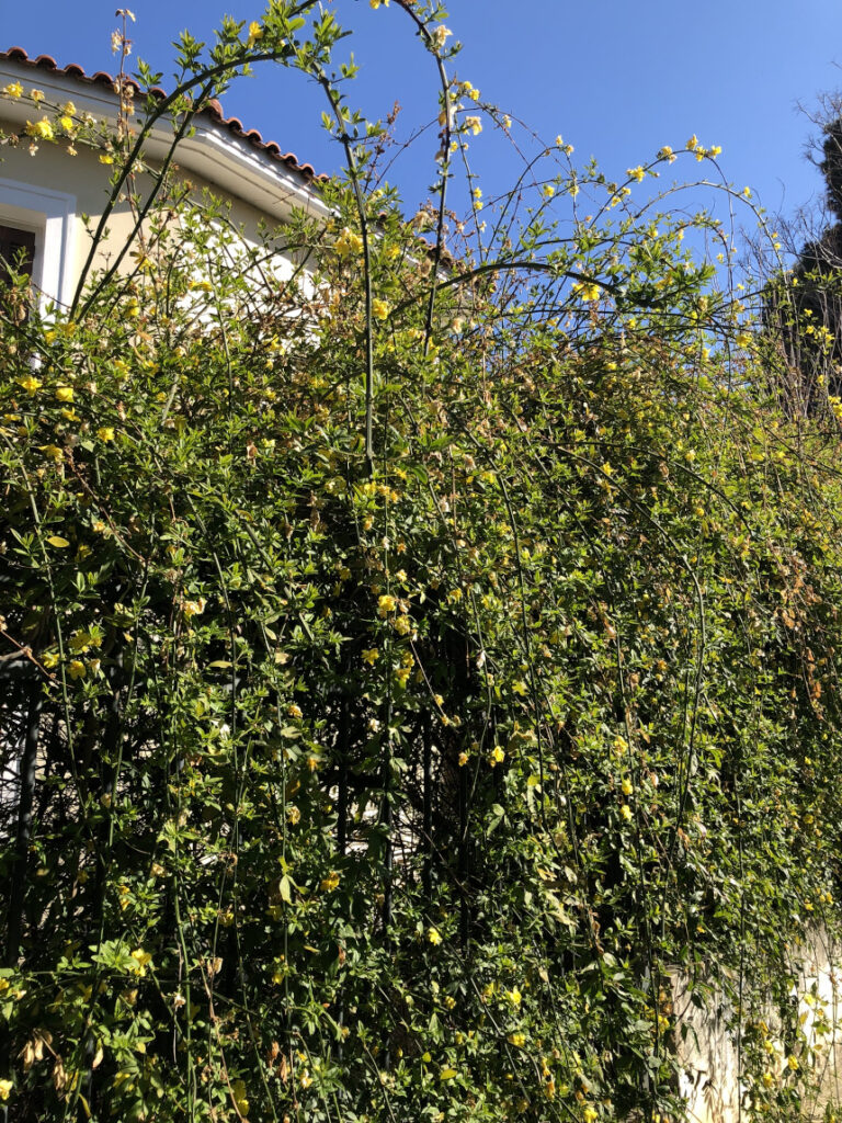 Είναι το Κίτρινο Γιασεμί. Μπορεί να μην έχει το μεθυστικό άρωμα που έχουμε συνδέσει με το όνομά του, αλλά η οπτική του παρουσία είναι αφοπλιστική. Γιατί αξίζει να το προσέξεις: Το έντονο κίτρινο πάνω στο βαθύ πράσινο είναι μια ένεση αισιοδοξίας, ειδικά κάτω από το γαλανό ουρανό. Στέκεται εκεί, «φρουρός» του σπιτιού, προσφέροντας ιδιωτικότητα και ομορφιά χωρίς να ζητάει πολλά.