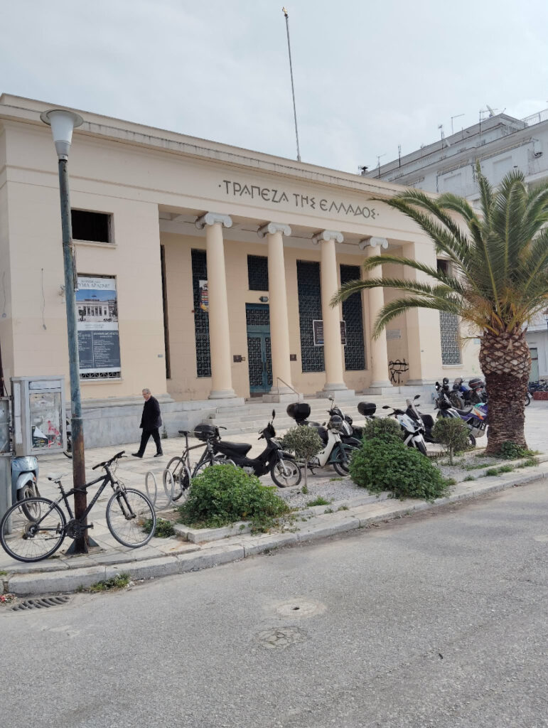 - Οι Ιωνικοί Κίονες: Η πρόσοψη με τους τέσσερις κίονες δημιουργεί μια αίσθηση “ναού” του χρήματος, εναρμονισμένη με την κλασική ελληνική παράδοση.
