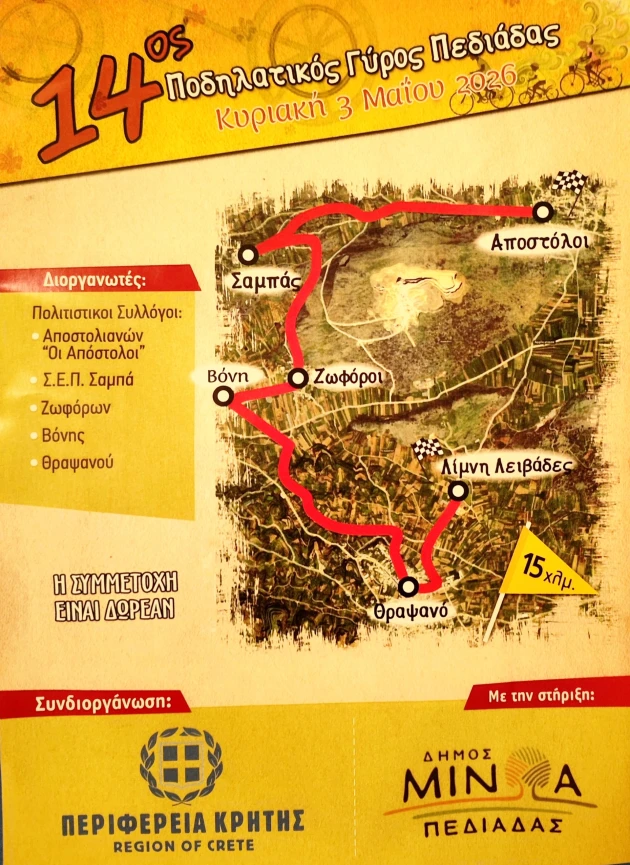 Ημέρα Κυριακή και ώρα 11:00 θα πραγματοποιηθεί ο ποδηλατικός γύρος πεδιάδας, για 14η χρονιά όπως έχει καθιερωθεί.