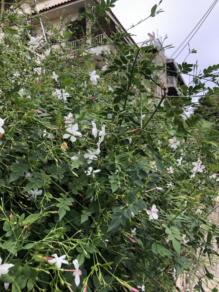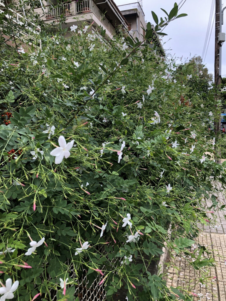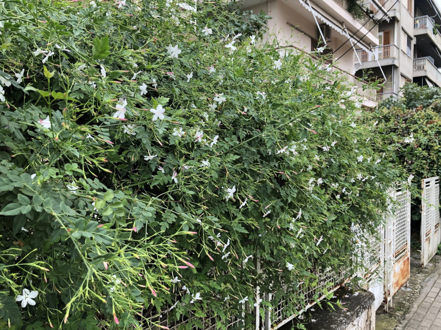 Είναι εκείνες οι καθημερινές διαδρομές που ξαφνικά μεταμορφώνονται σε μικρές ανακαλύψεις. Στη γωνιά ενός δρόμου στον Χολαργό, ανάμεσα στις πολυκατοικίες και την κίνηση της πόλης, βρέθηκα αντιμέτωπος με ένα θέαμα που μου έκοψε την ανάσα και μου γαλήνεψε την ψυχή. Δεν ήταν απλώς ένας φράχτης. Ήταν ένας καταρράκτης πράσινου που χυνόταν πάνω από το παλιό, σιδερένιο πλέγμα. Και πάνω σε αυτόν τον καταρράκτη, χιλιάδες μικρά, λευκά, αστερόμορφα άνθη: το γιασεμί σε όλο του το μεγαλείο!