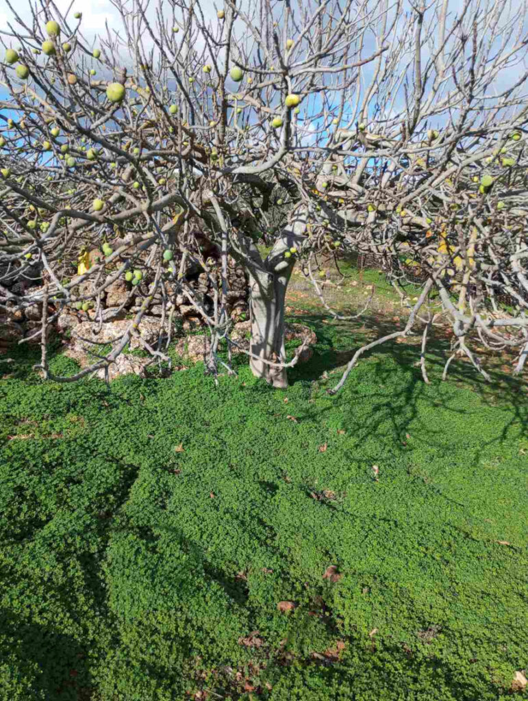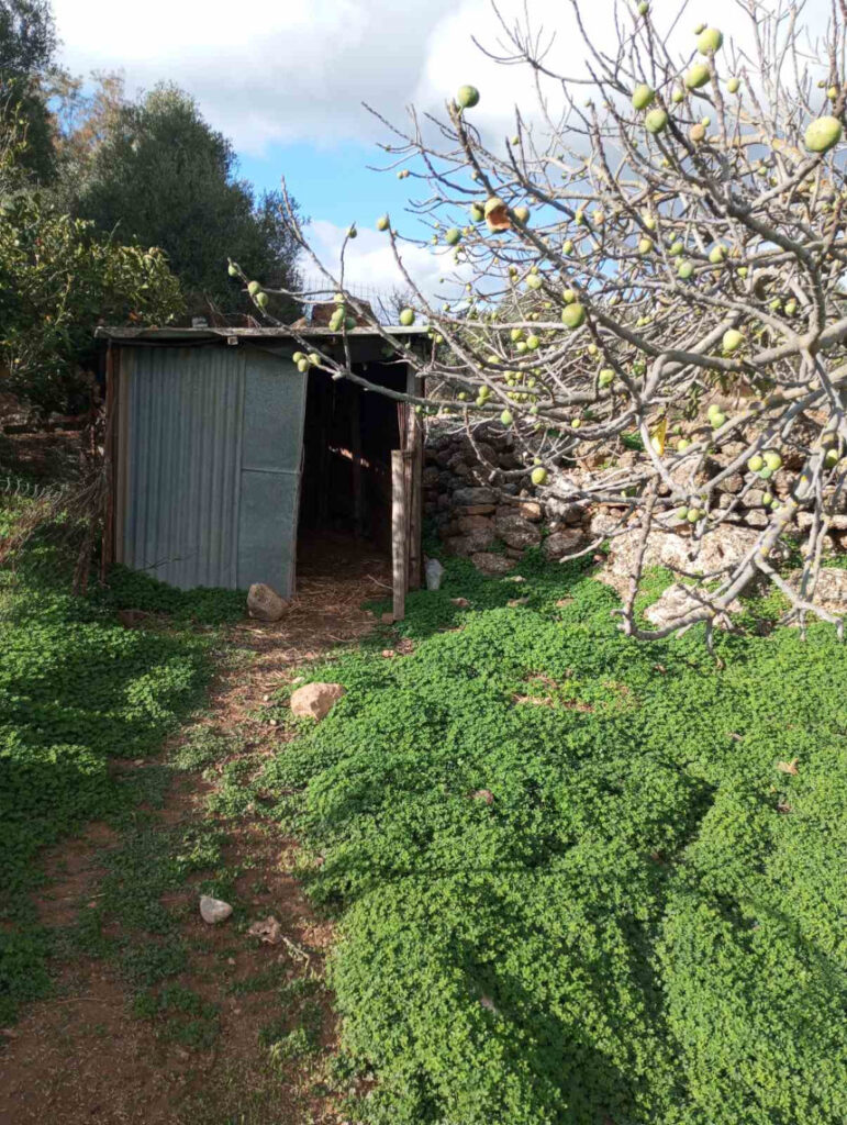 Αυτά τα χειμωνιάτικα σύκα δεν είναι απλώς διακοσμητικά. Είναι φαγώσιμα, μια απόδειξη της μοναδικής αντοχής και γενναιοδωρίας του μεσογειακού κλίματος και της κρητικής γης. Κάτω από τον ίσκιο της, το έδαφος είναι στρωμένο με ένα καταπράσινο, ζωηρό χαλί από τριφύλλι, (ή όπως το λέμε εμείς λουλούδι) που δίνει μια νότα φρεσκάδας στη χειμωνιάτικη εικόνα. Λίγο παραπέρα, δίπλα σε έναν παραδοσιακό πέτρινο τοίχο, είναι ένα μικρό μεταλλικό υπόστεγο Εδώ η ζωή κυλάει σε ρυθμούς αγνούς, παραγωγικούς και δεμένους με τη γη. Εκείνη είναι η αρχόντισσα και ο άνθρωπος ο πιστός καλλιεργητής.