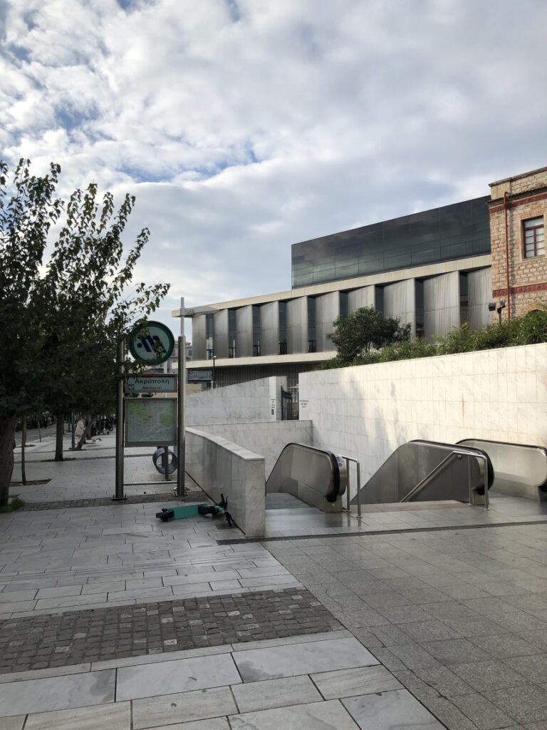 Οι φωτογραφίες αποτυπώνουν την είσοδο του σταθμού, με τη χαρακτηριστική κυκλική σήμανση και τις κυλιόμενες σκάλες που οδηγούν κάτω, εκεί όπου η σύγχρονη Αθήνα συναντά τους θησαυρούς που αποκαλύφθηκαν κατά την κατασκευή του Μετρό. Ακριβώς δίπλα, διακρίνεται το Μουσείο Ακρόπολης, ένα αρχιτεκτονικό κομψοτέχνημα που δίνει έναν τόνο μεγαλοπρέπειας στην περιοχή. Αν και ο κόσμος ήταν λιγοστός με περαστικούς να βιάζονται για τις δουλειές τους –όπως ο κύριος με το κοστούμι– και μικρές παρέες να συζητούν.